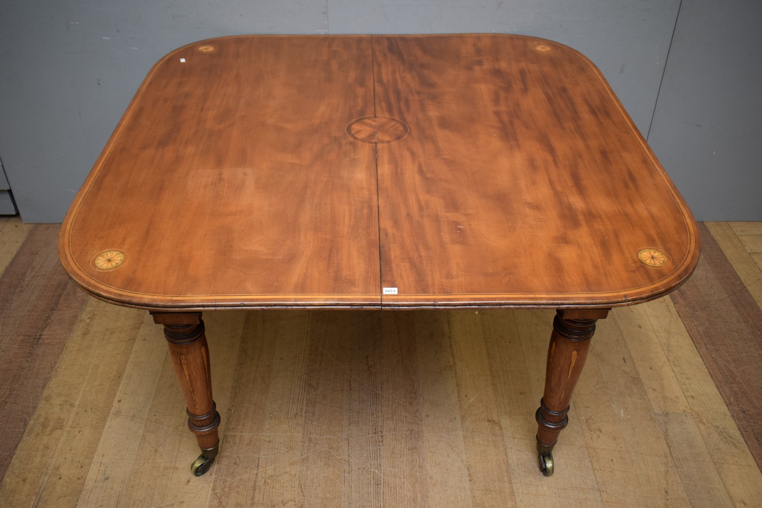 A SHERATON REVIVAL INLAID DINING TABLE (A/F) ( 73H X 130W X 129D CM) (LEONARD JOEL DELIVERY SIZE: LARGE) (PLEASE NOTE THIS HEAVY ITEM MUST BE REMOVED BY CARRIERS AT THE CUSTOMER'S EXPENSE. LEONARD JOEL STAFF CANNOT ASSIST CARRYING THIS ITEM) (X-LARGE ITEM)