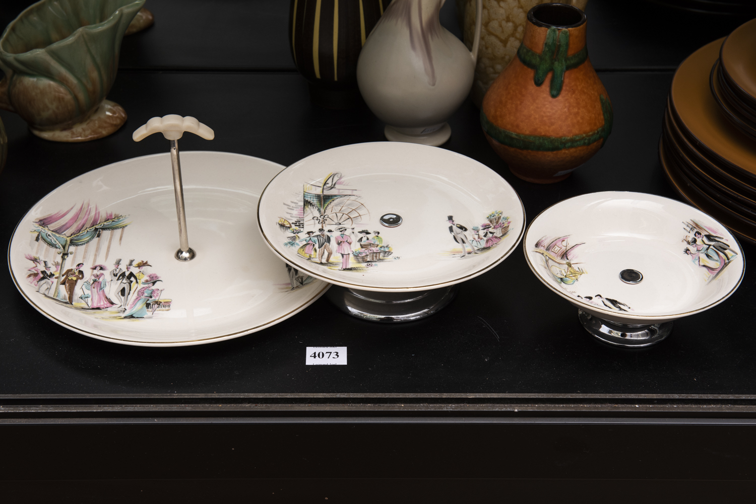 AN ALFRED MEAKIN 'MY FAIR LADY' CAKE PLATE AND TWO COMPORTS, LEONARD JOEL LOCAL DELIVERY SIZE: SMALL (22.5 CM D)