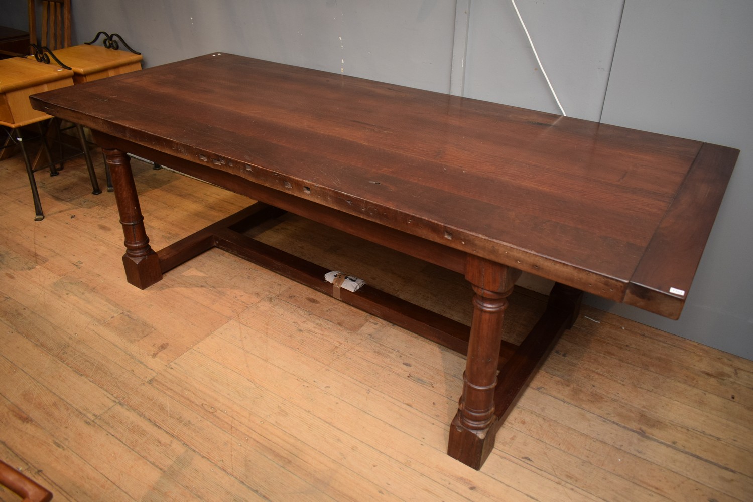 A SUBSTANTIAL FARMHOUSE STYLE REFECTORY TABLE (80H x 245W x 103D CM) (PLEASE NOTE THIS HEAVY ITEM MUST BE REMOVED BY CARRIERS AT THE CUSTOMER'S EXPENSE. LEONARD JOEL STAFF CANNOT ASSIST CARRYING THIS ITEM) (X-LARGE ITEM)
