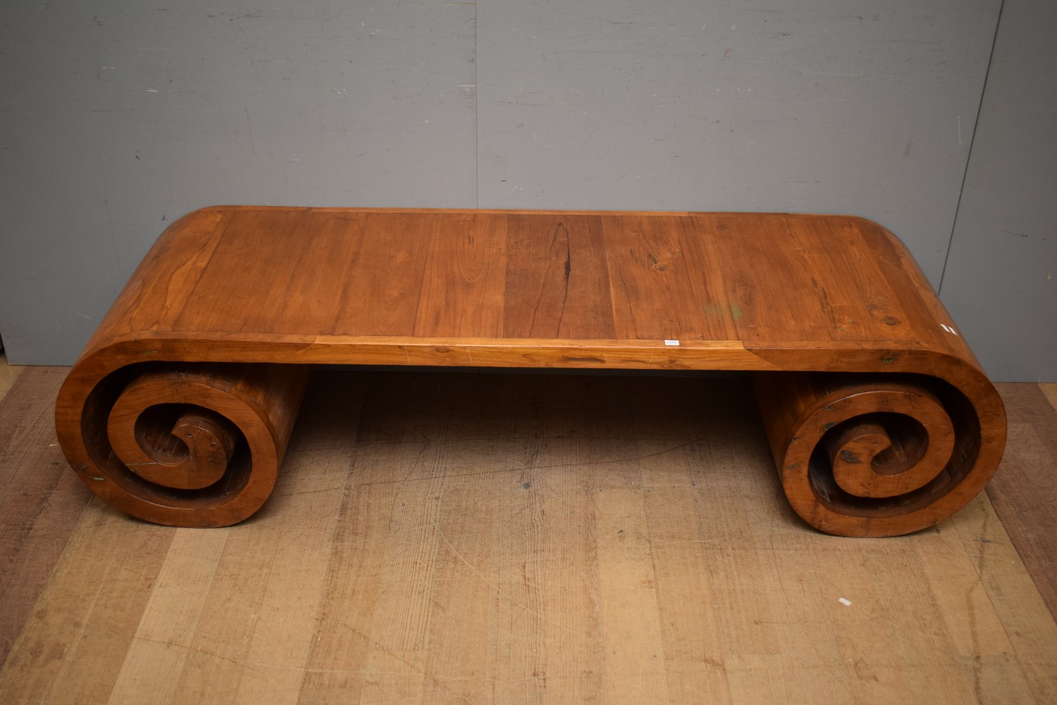 A LARGE TIMBER BENCH WITH SCROLLED ENDS (45H x 186W x 61D CM) (PLEASE NOTE THIS HEAVY ITEM MUST BE REMOVED BY CARRIERS AT THE CUSTOMER'S EXPENSE. LEONARD JOEL STAFF CANNOT ASSIST CARRYING THIS ITEM) (X-LARGE ITEM)