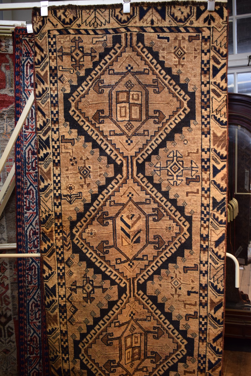 A CIRCA 1940s TRIBAL PERSIAN LURI RUG. 100% WOOL. VINTAGE PILE. HAND-KNOTTED TRIBAL WEAVE WITH DESIGN OF TRIPLE HOOKED MEDALLION AND SEMI-MEDALLIONS IN A CHARCOAL-TONED FIELD. FULLY RESTORED & IN GOOD CONDITION. CERTIFICATE OF AUTHENTICITY INCLUDED. SIZE: 215X95CM, ORIGIN: PERSIA - RRP: $1900