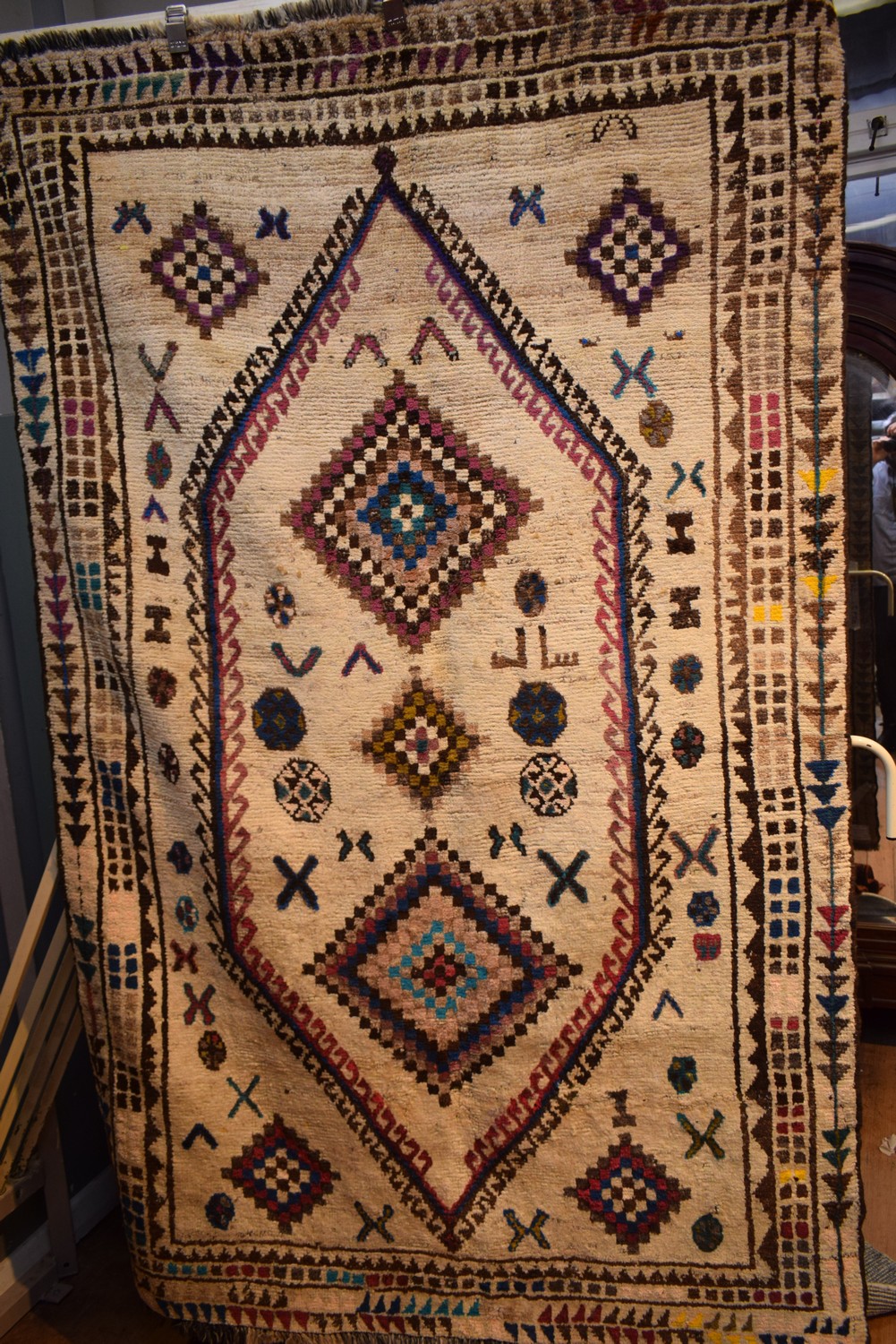 A TRIBAL PERSIAN QASHQAIE GABBEH RUG. 100% WOOL FOUNDATION & PILE. WOVEN 1999 (INSCRIBED ON RUG). HAND-SPUN WOOL. NATURAL DYES. SOLID & DENSE. HAND-KNOTTED TRIBAL QASHQAIE WEAVE WITH DESIGN OF GEOMETRIC MEDALLIONS AND PATTERNS SET WITHIN A HEXAGONAL LATCH-HOOKED PATTERN. EX-GALLERY INVENTORY. IN EXCELLENT CONDITION. CERTIFICATE OF AUTHENTICITY INCLUDED. SIZE: 235X150CM, ORIGIN: PERSIA - RRP: $2,400