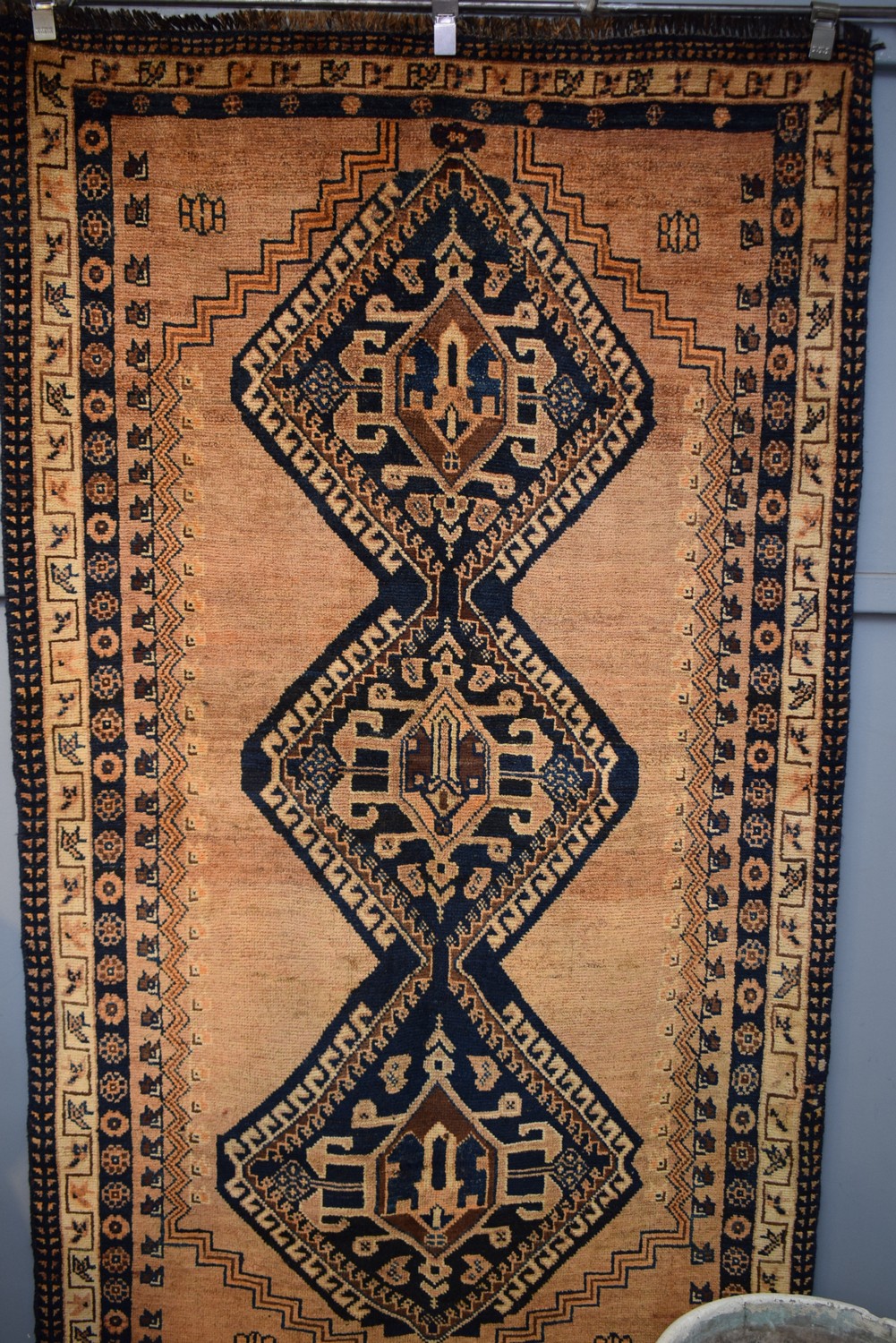 A CIRCA 1970s TRIBAL PERSIAN LURI RUG. 100% WOOL. VINTAGE PILE. BEAUTIFULLY MELLOWED COLOURS. HAND-KNOTTED TRIBAL WEAVE WITH DESIGN OF TRIPLE HOOKED MEDALLION CONTAINING AMULETS SET WITHIN AN OPEN FIELD. BORDER OF FLOWER HEADS. FULLY RESTORED & IN GOOD CONDITION. CERTIFICATE OF AUTHENTICITY INCLUDED. SIZE: 230X130CM, ORIGIN: PERSIA - RRP: $2,800