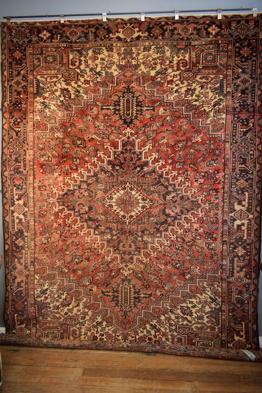 A PERSIAN HERIZ GEROVAN CARPET. 100% WOOL PILE. NATURAL DYES. HAND-WOVEN IN THE VILLAGES OF THE HERIZ REGION, AN IMPORTANT CARPET-PRODUCING REGION OF AZERBAIJAN PROVINCE WITH TRADITIONAL DESIGN OF BOLD DOMINANT DIAMOND-SHAPED MEDALLION & QUARTERED CORNER MEDALLIONS IN A MADDER-TONED FIELD OF PALMETTES & OAK LEAVES. BORDER OF HERATI PATTERNS. GALLERY INVENTORY. IN EXCELLENT CONDITION. CERTIFICATE OF AUTHENTICITY INCLUDED. SIZE: 349X259CM, ORIGIN: PERSIA - RRP: $7,900
