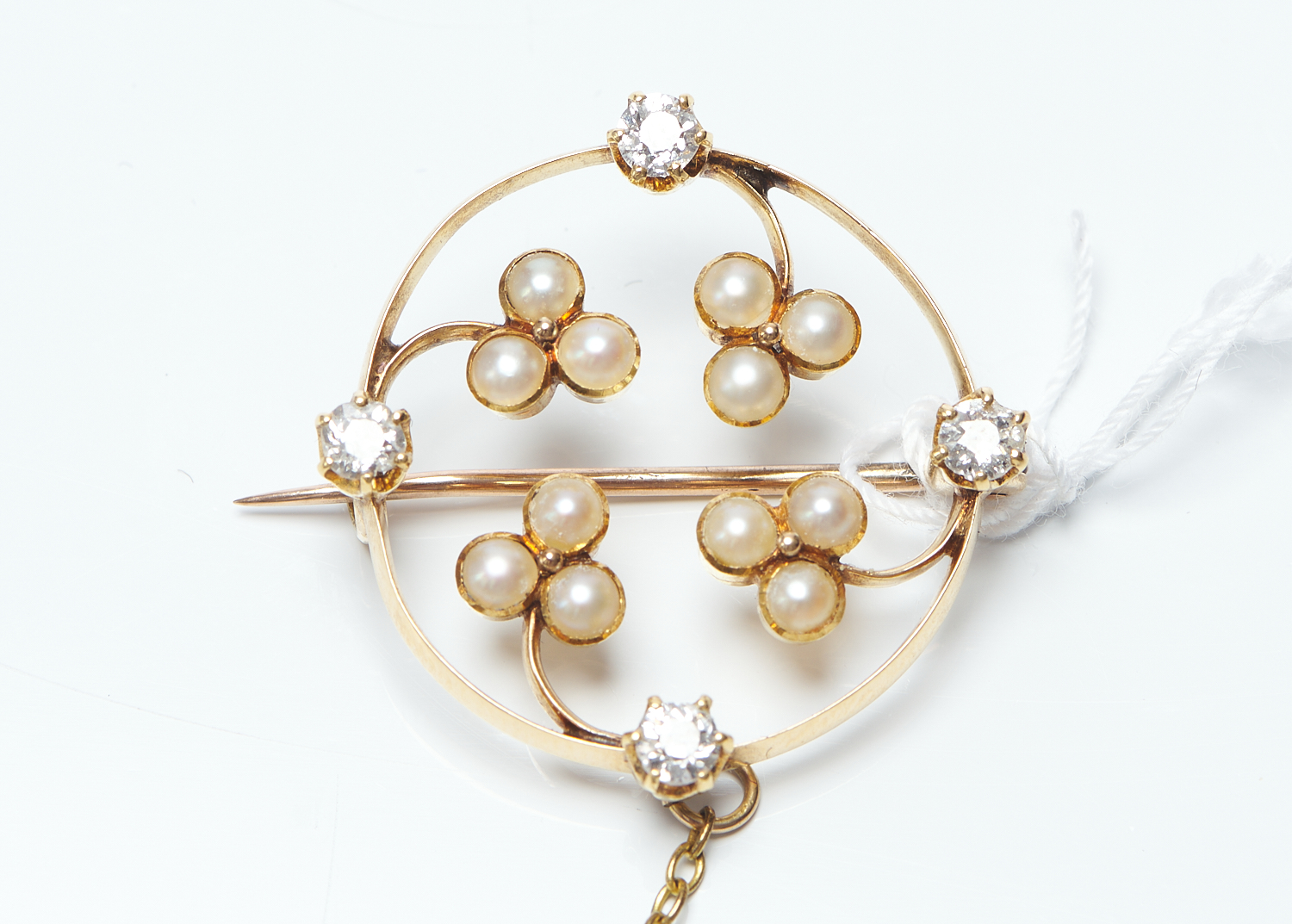 AN ANTIQUE SEED PEARL AND DIAMOND BROOCH IN GOLD, LENGTH 25MM, 4GMS