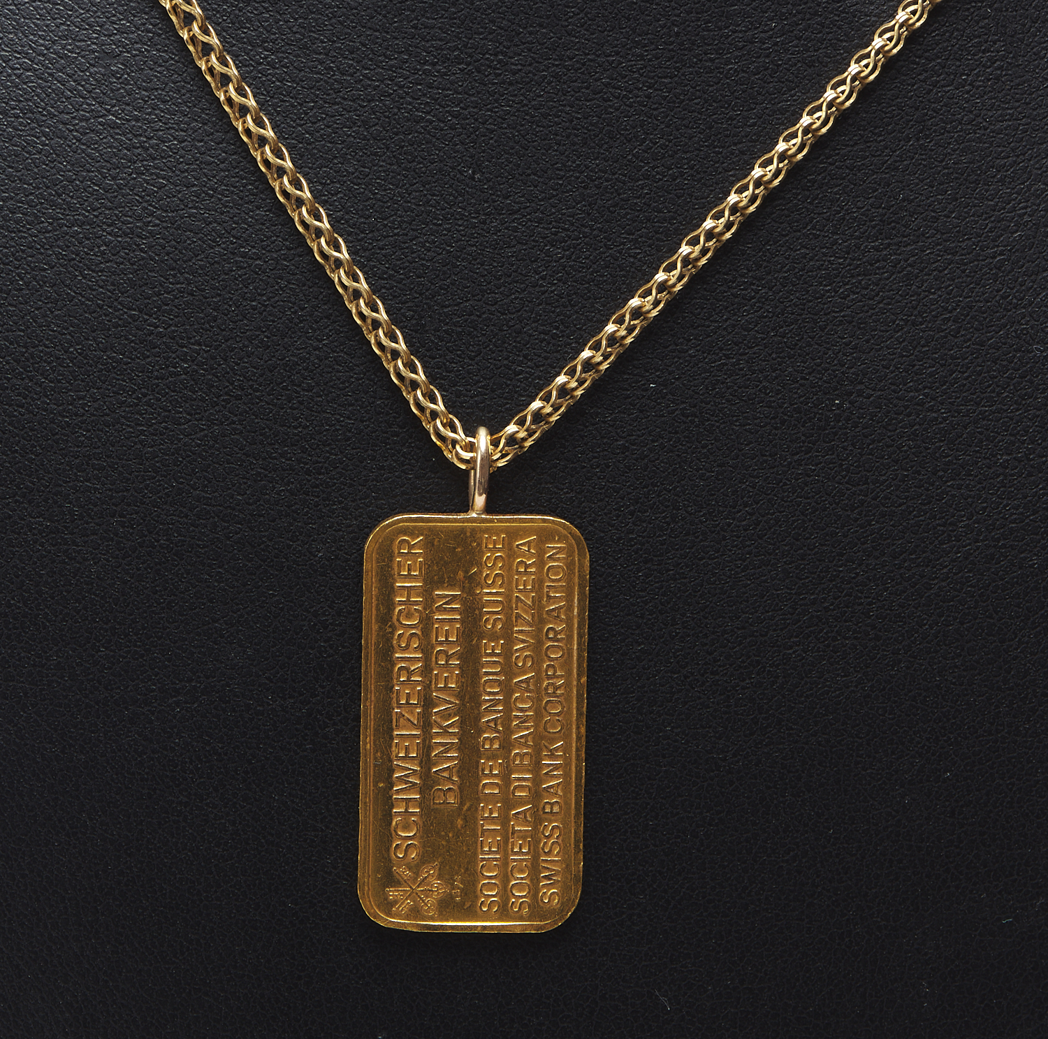 A 10 GRAM 999.99 GOLD BAR PENDANT TO AN 18CT GOLD CHAIN, TOTAL WEIGHT 15.8GMS