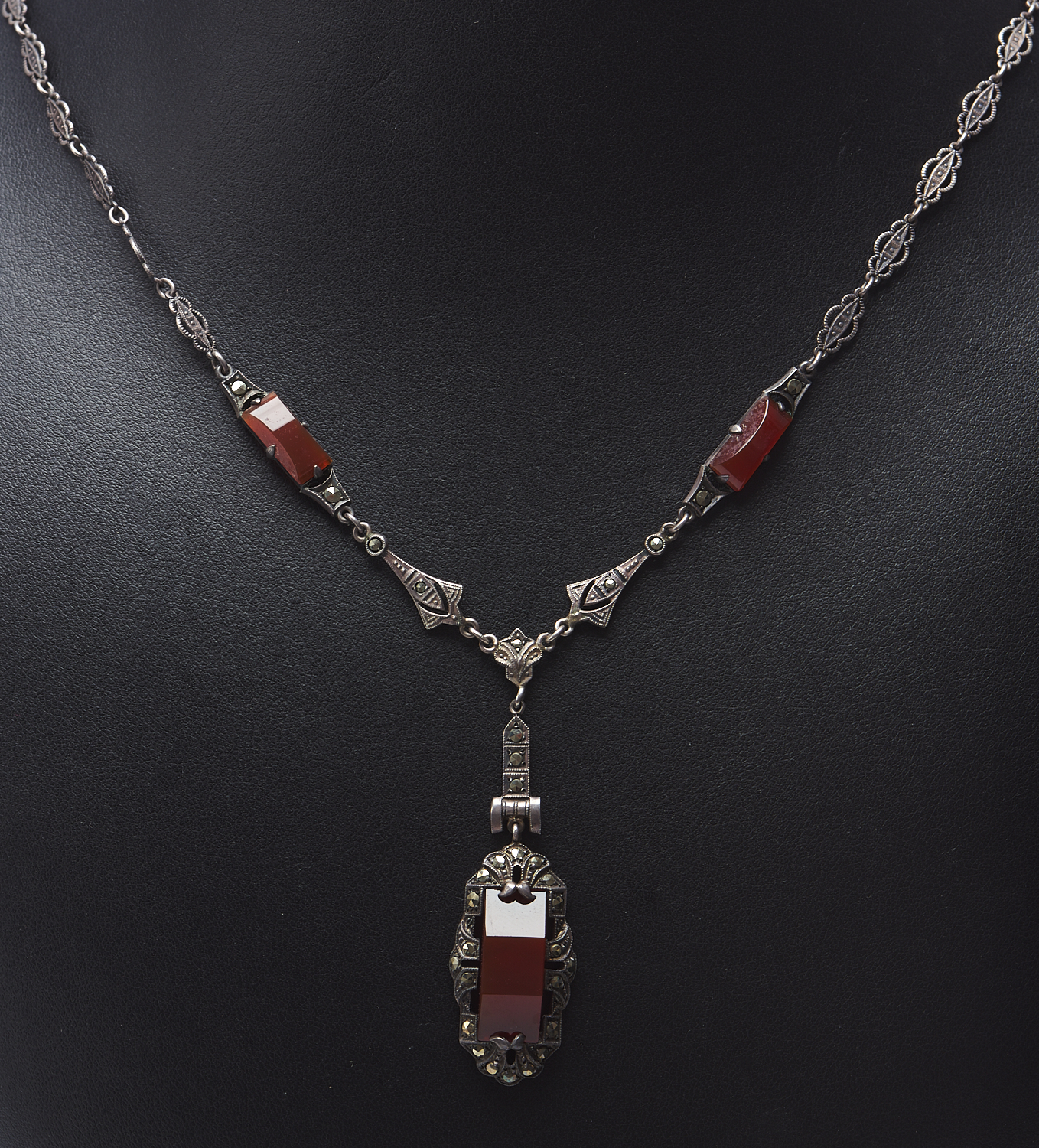 AN ART DECO NECKLACE SET WITH RESIN AND MARCASITE IN STERLING SILVER, LENGTH 30CMS