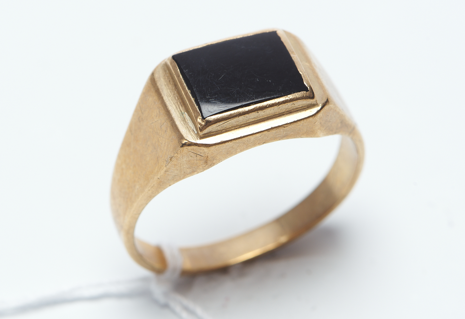 A GENTLEMAN ONYX RING IN 9CT GOLD, SIZE T, 4.2GMS