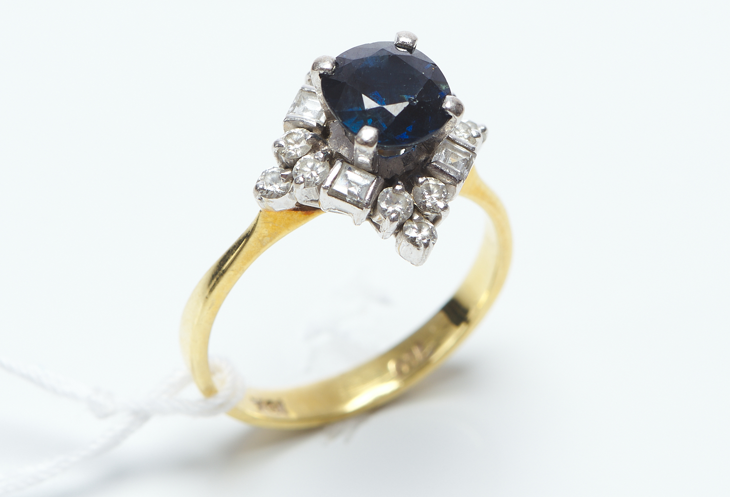 A SAPPHIRE AND DIAMOND DRESS RING IN TWO TONE 18CT GOLD, FEATURING A BLUE SAPPHIRE OF AN ESTIMATED, SIZE P, 4.5GMS