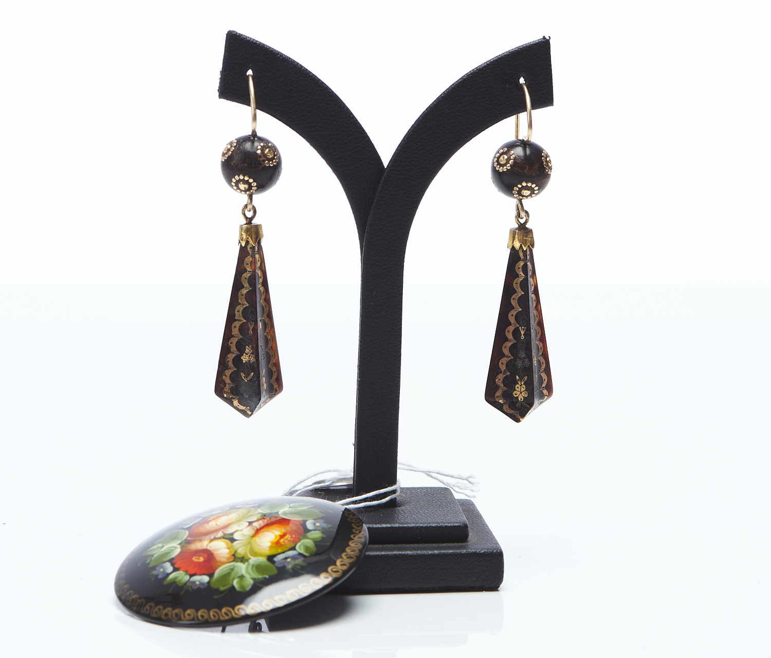 A PAIR OF PIQUÉ DROP EARRINGS (LENGTH 55MM) TO SHEPHERD HOOK FITTINGS, TOGETHER WITH A HANDPAINTED PAPIER MACHÉ BROOCH