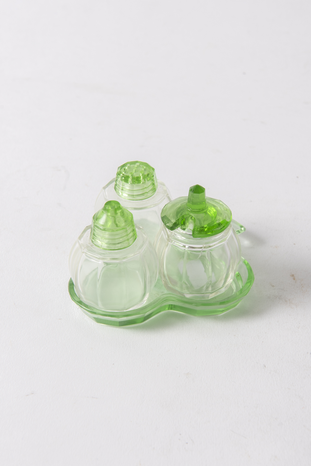 A VINTAGE CRUET SET ON TRAY IN THE FORM OF A CLOVER, LEONARD JOEL LOCAL DELIVERY SIZE: SMALL 7 cms H