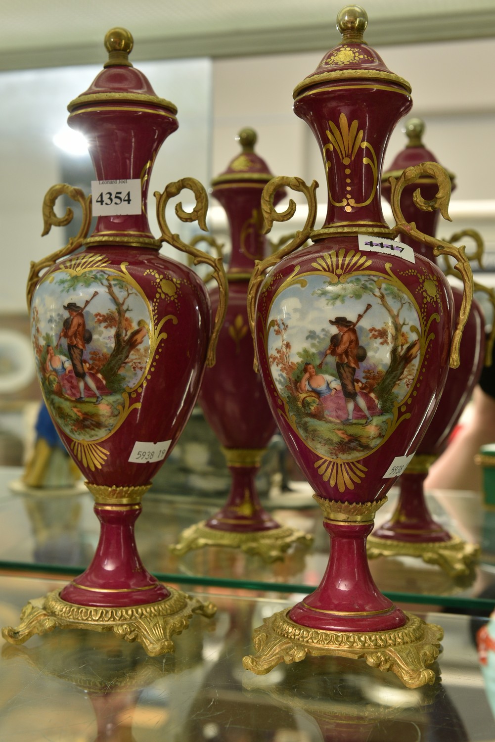 A PAIR OF SEVRES STYLE GILT METAL MOUNTED URNS, PUCE GROUND (31 CM H), LEONARD JOEL LOCAL DELIVERY SIZE: SMALL