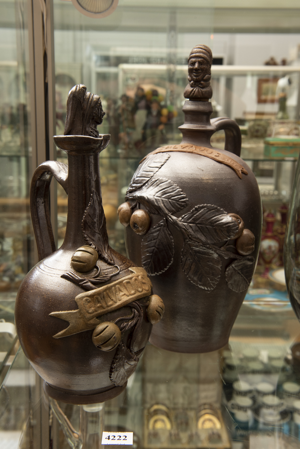 TWO VINTAGE FRENCH POTTERY CALVADOS JUGS WITH IMPRESSED MARK A TURGIS LE TRONQUAY CALVADOS (A/F) (34 CM HIGHEST), LEONARD JOEL LOCAL DELIVERY SIZE: SMALL