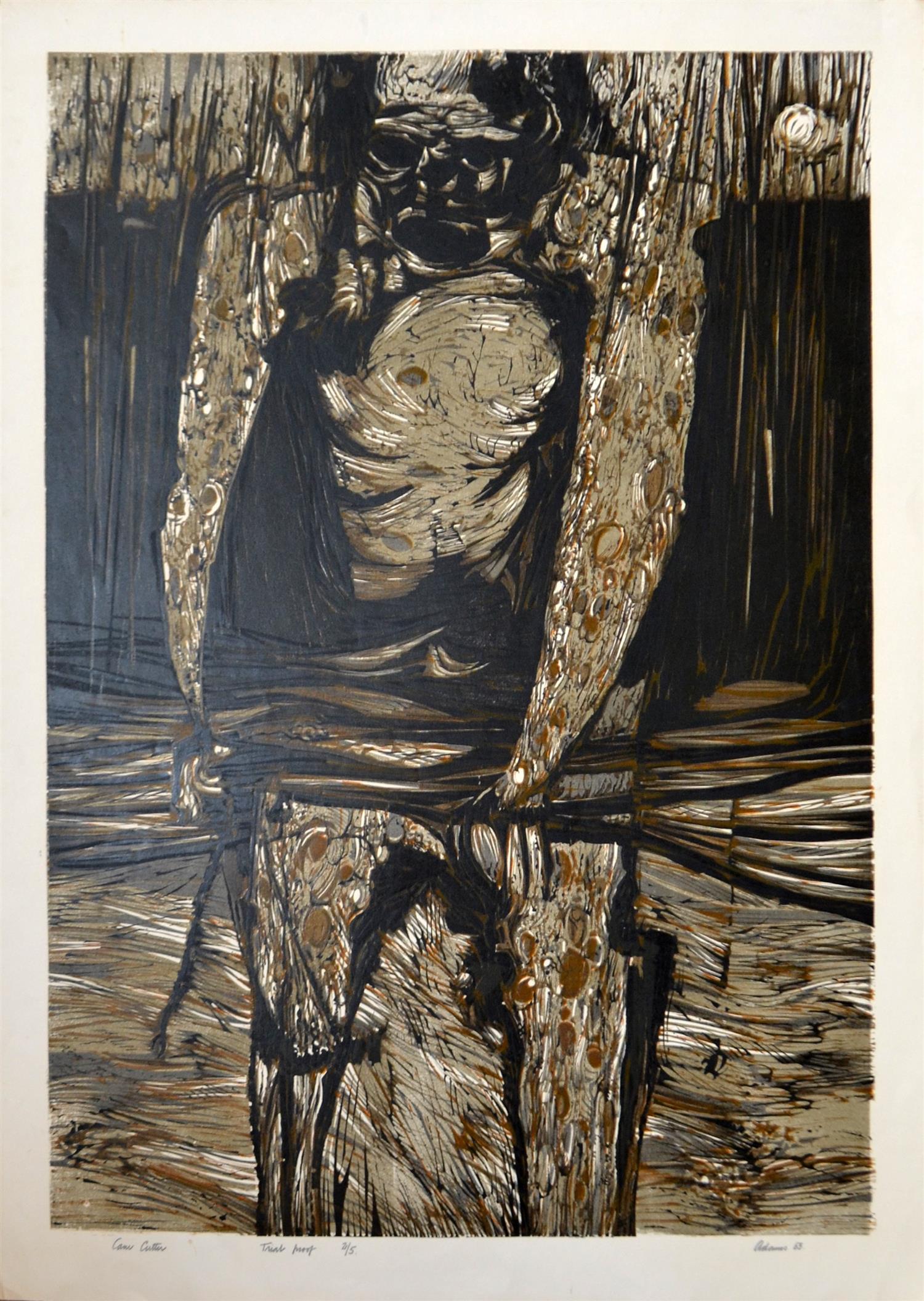 TATE ADAMS, CANE CUTTER 1963, LINOCUT 2/5, 84 X 57CM (UNFRAMED), LEONARD JOEL DELIVERY SIZE: SMALL, CONDITION: GOOD, MINOR HANDLING MARKS AND CREASES