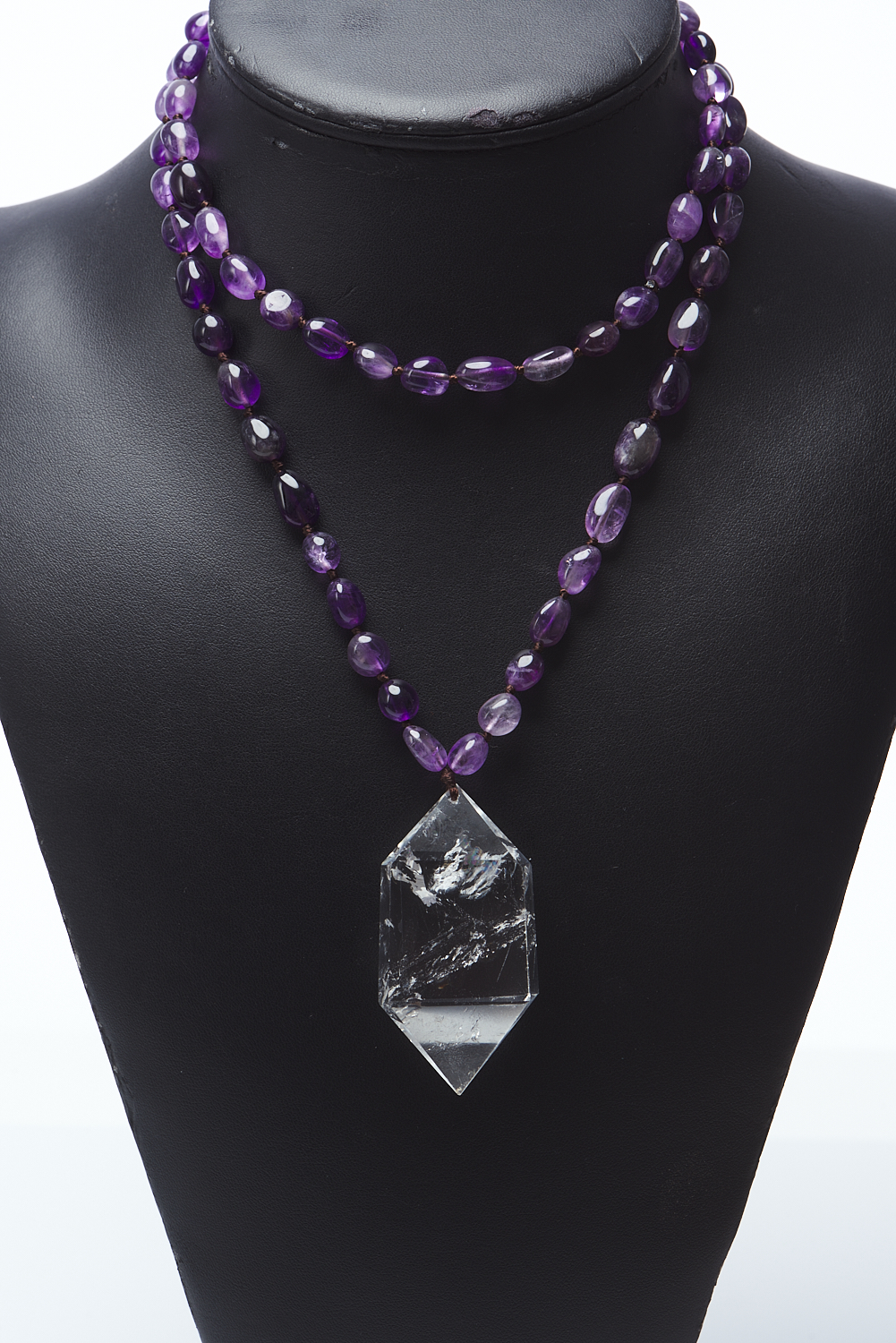 AN AMETHYST BEAD WITH QUARTZ PENDANT NECKLACE, LENGTH 46CMS