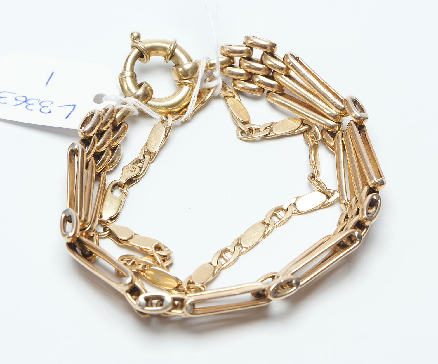 TWO BRACELETS IN 9CT GOLD, THE GATELINK LINK MEASURING 21CMS AND THE OTHER 19.5CMS, TOTAL WEIGHT 44GMS