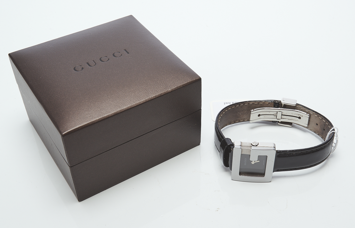 A LADIES QUARTZ "G" WATCH BY GUCCI WITH BOX