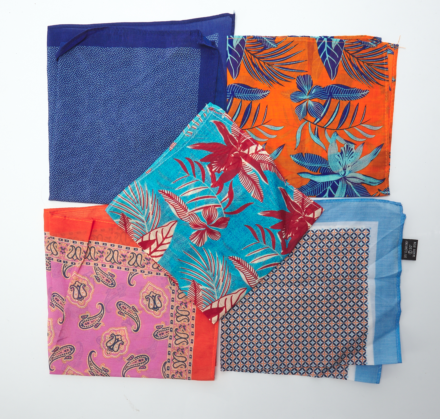 FIVE SILK AND COTTON POCKET SQUARES