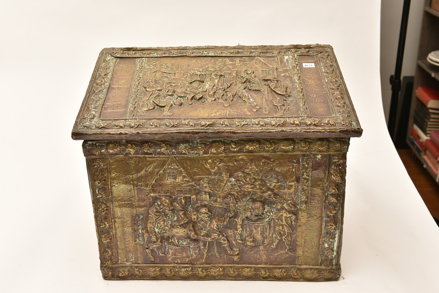 AN ORNATE EMBOSSED BRASS MOUNTED FIRE BOX (54 CM W), LEONARD JOEL LOCAL DELIVERY SIZE: SMALL