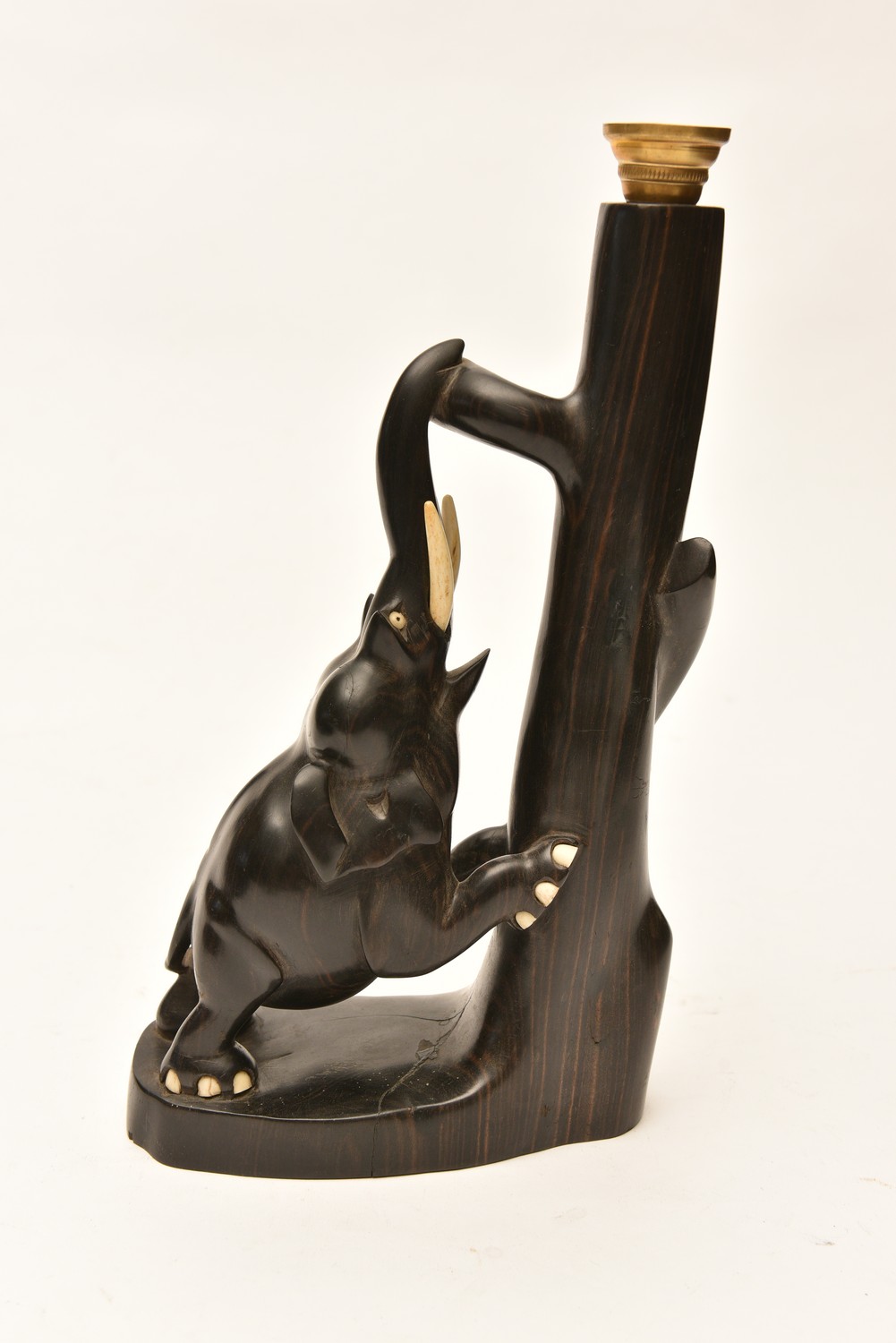 A BONE MOUNTED EBONY ELEPHANT LAMP BASE (33 CM H), LEONARD JOEL LOCAL DELIVERY SIZE: SMALL