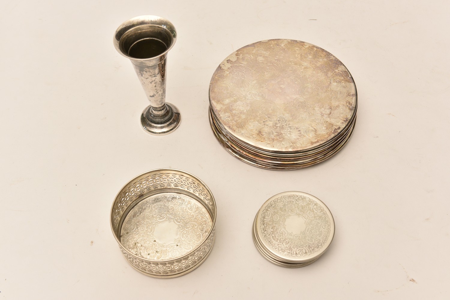 SIX STRACHAN PLACEMANTS, FIVE COASTERS, A BOTTLE COASTER AND A VASE (18 CM D), LEONARD JOEL LOCAL DELIVERY SIZE: SMALL