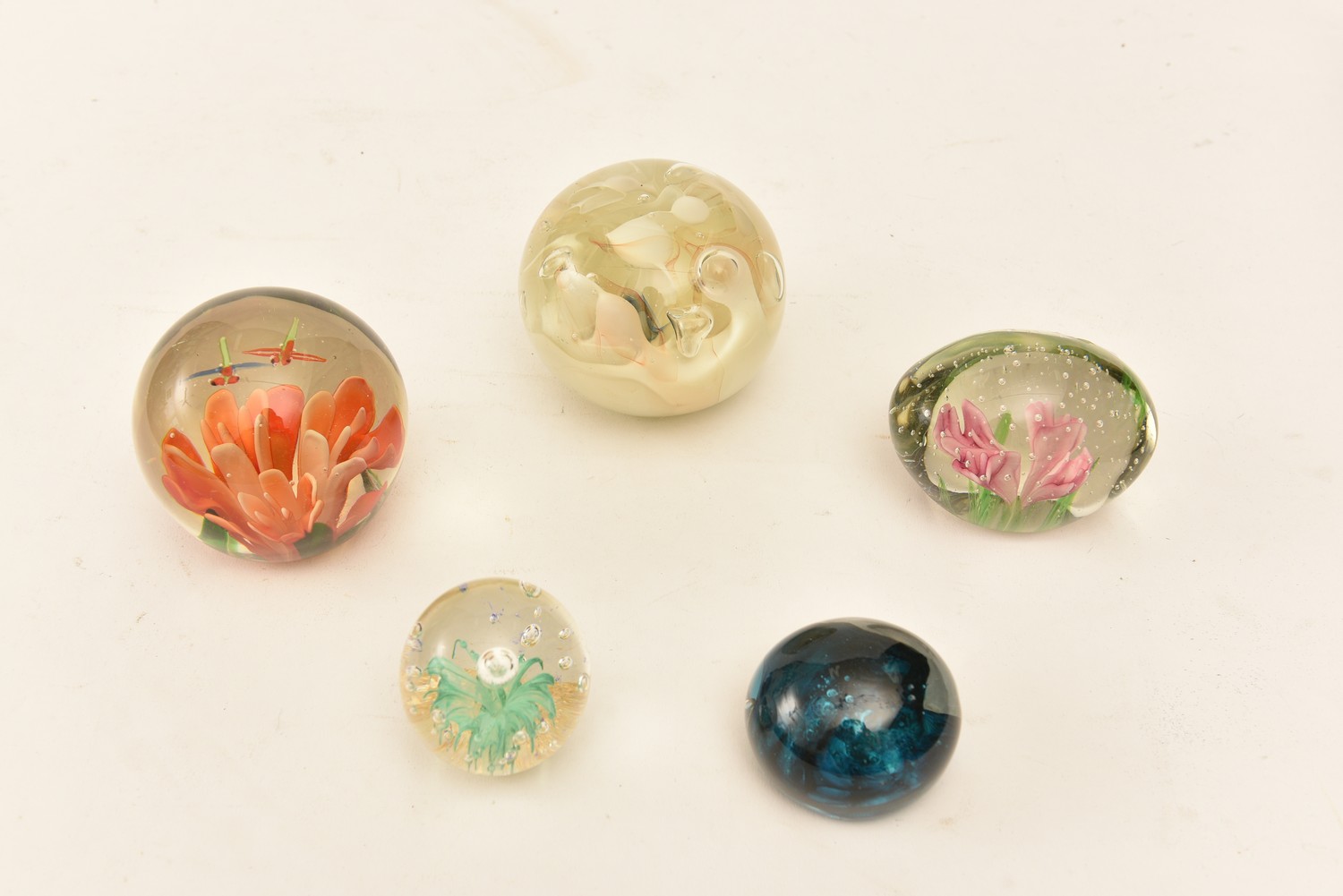 FIVE ART GLASS ORNAMENTS/PAPERWEIGHTS, LEONARD JOEL LOCAL DELIVERY SIZE: SMALL