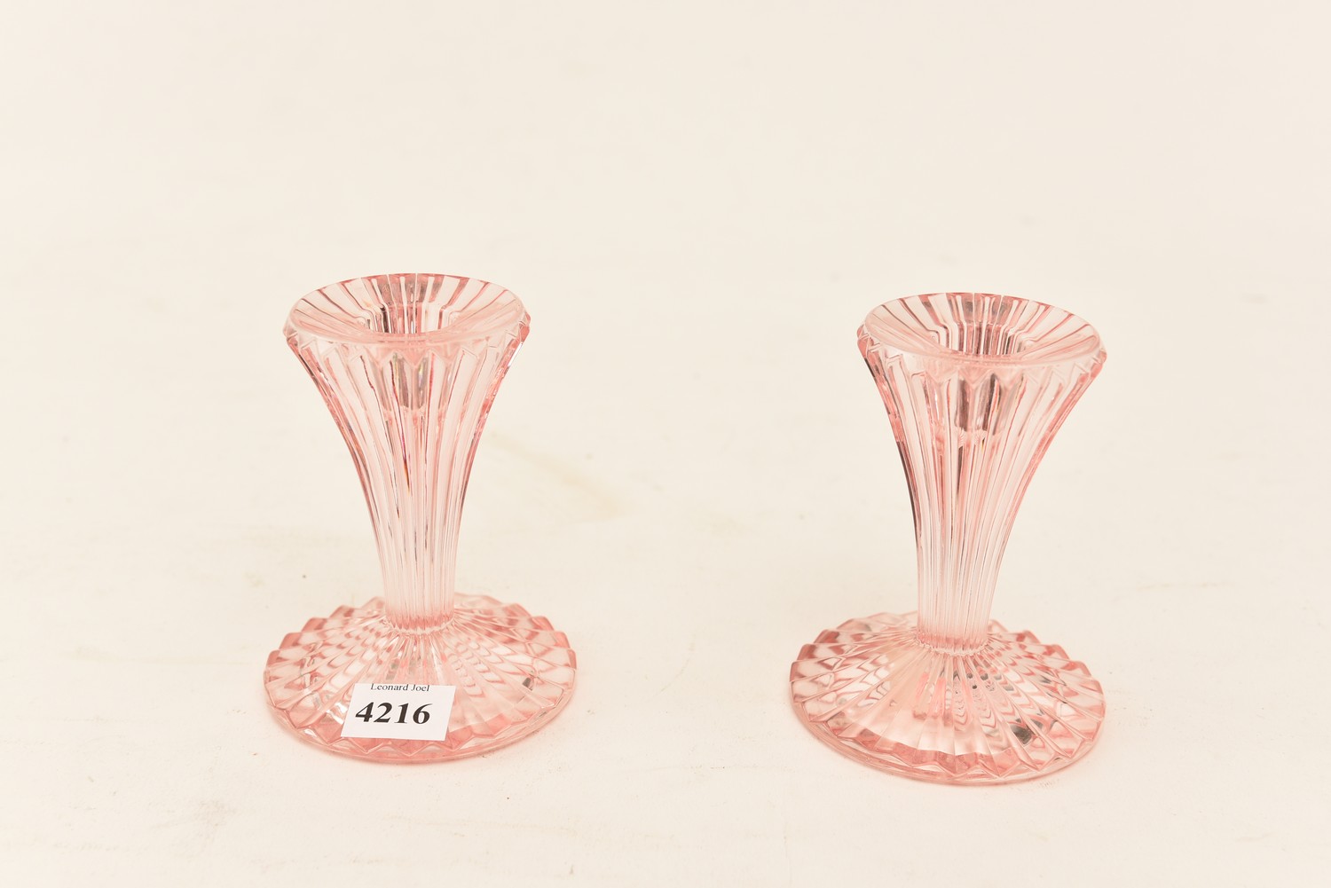 TWO MARQUIS BY WATERFORD BLUSH PINK CRYSTAL CANDLE HOLDERS, ETCHED FACTORY LAMP, LEONARD JOEL LOCAL DELIVERY SIZE: SMALL