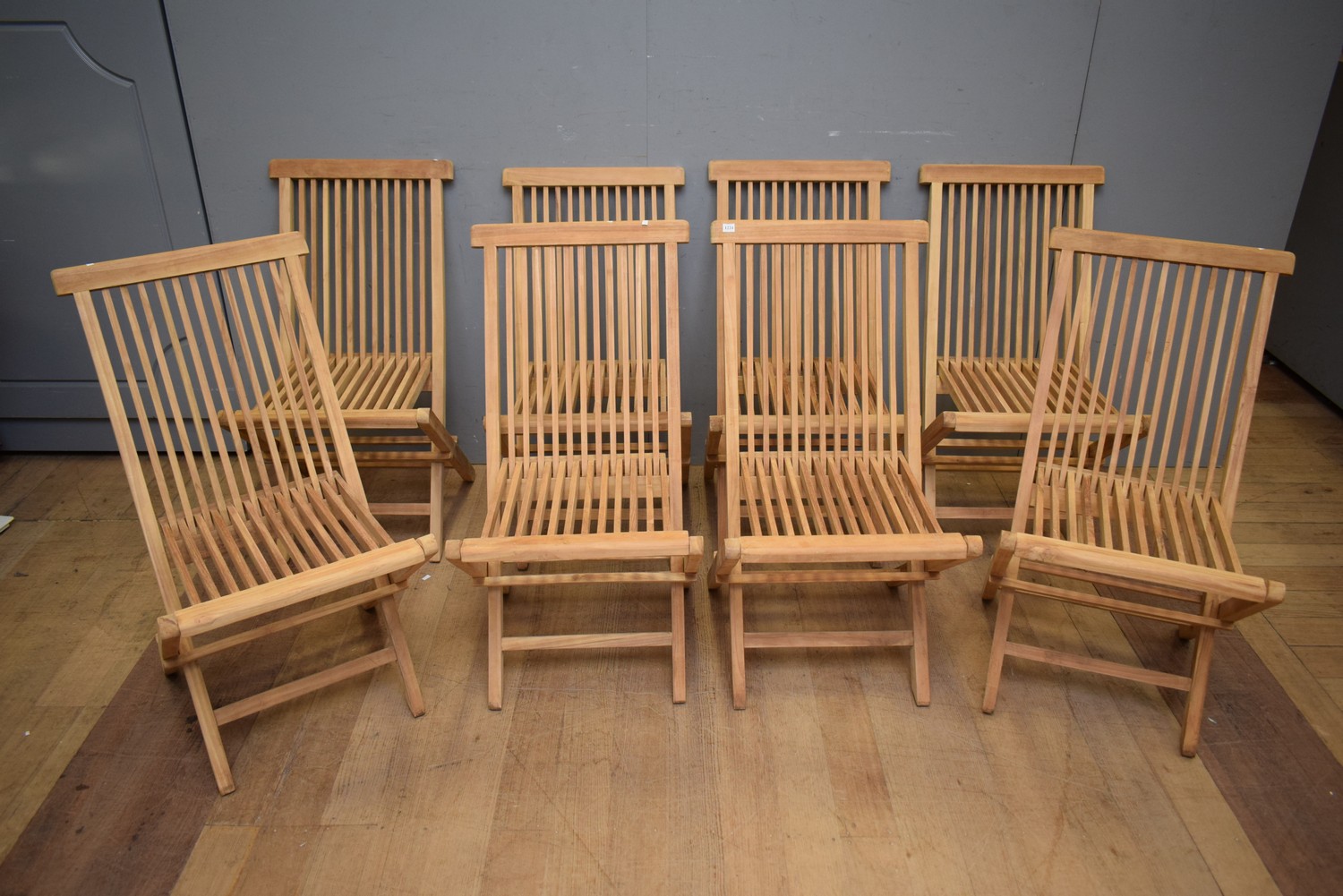 EIGHT TEAK OUTDOOR DINING CHAIRS (91H x 47W x 65D CM) (LEONARD JOEL DELIVERY SIZE: LARGE)