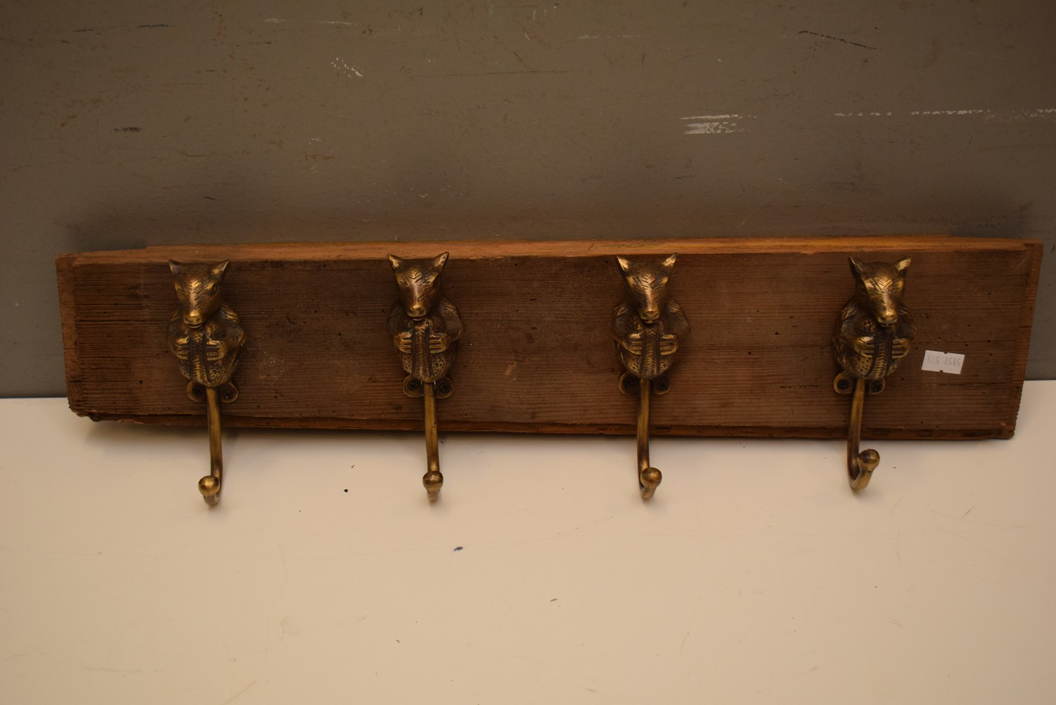 FOUR BRASS SQUIRREL COAT HOOKS (H14CM X W55CM OLD BORER HOLES TO WOOD) (LEONARD JOEL DELIVERY SIZE: SMALL)