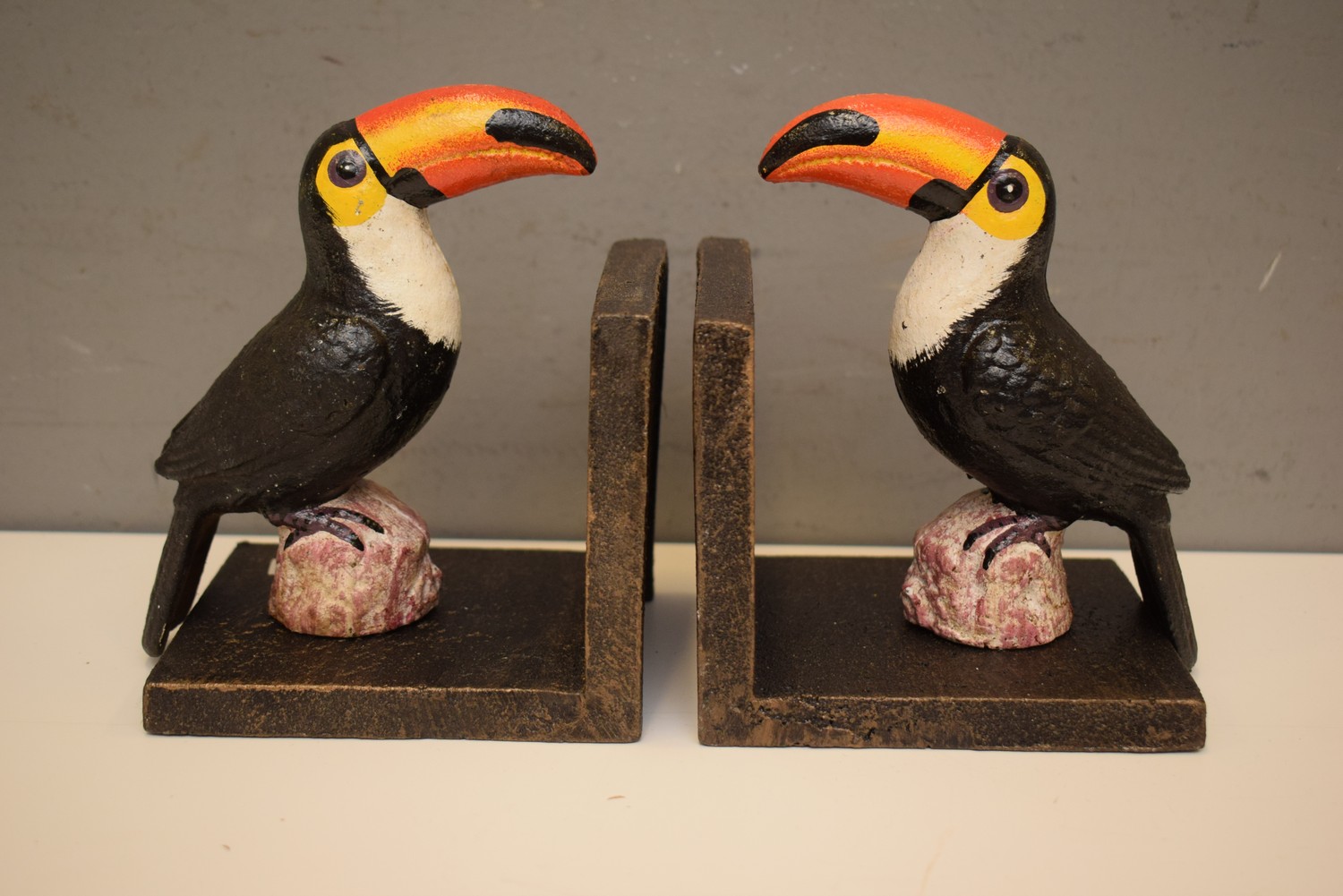 A PAIR OF METAL TOUCAN BOOKENDS (H15 CM) (LEONARD JOEL DELIVERY SIZE: SMALL)