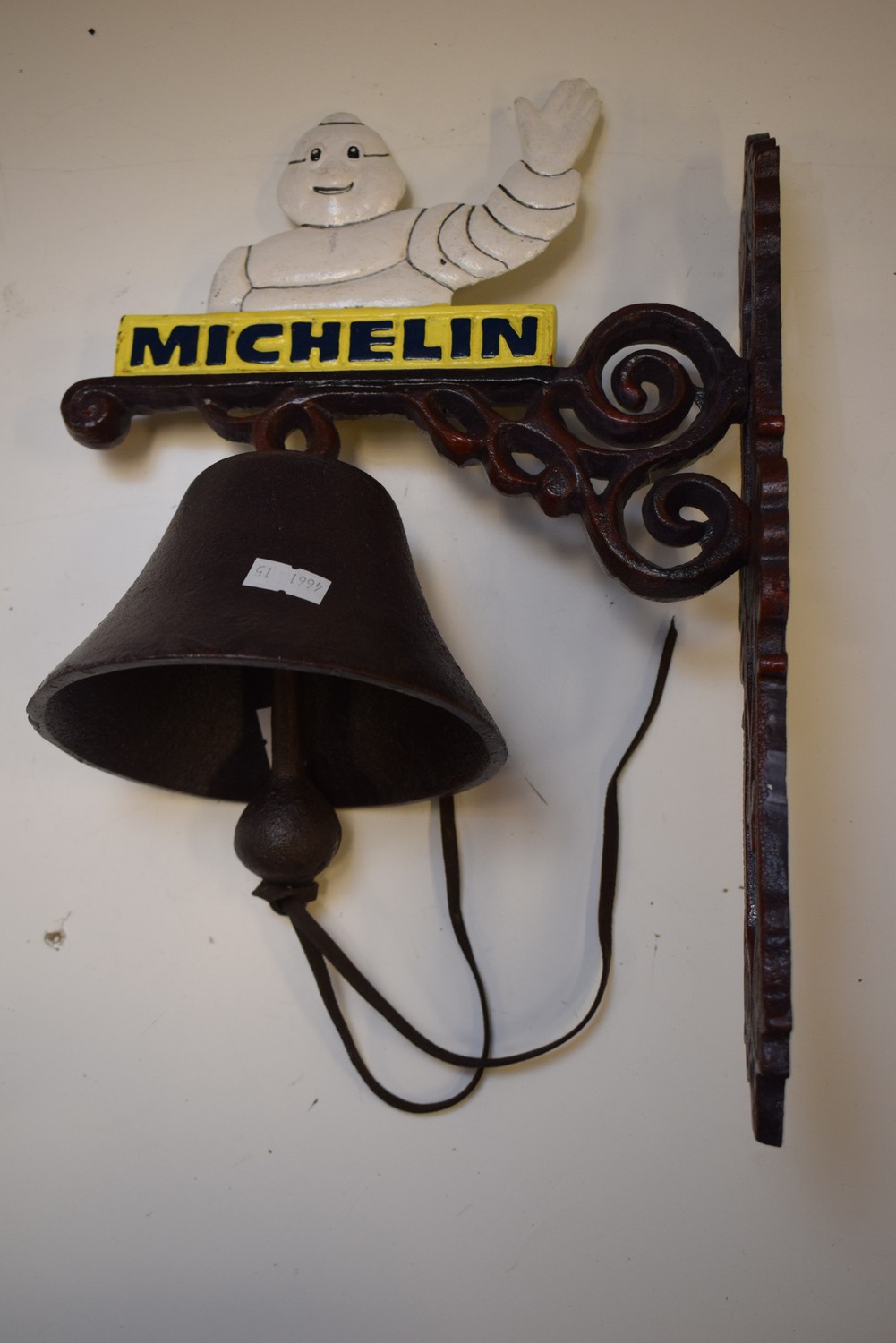 A METAL WALL MOUNTED MICHELIN BELL (H36CM X W23CM) (LEONARD JOEL DELIVERY SIZE: SMALL)