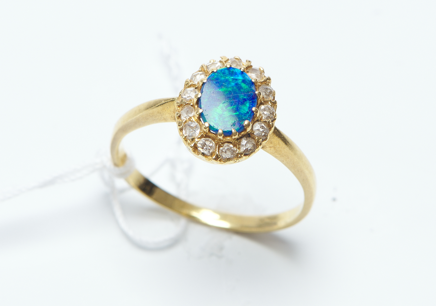 A SOLID OPAL RING WITH DIAMOND HALO IN 18CT GOLD, SIZE N, 2.5GMS