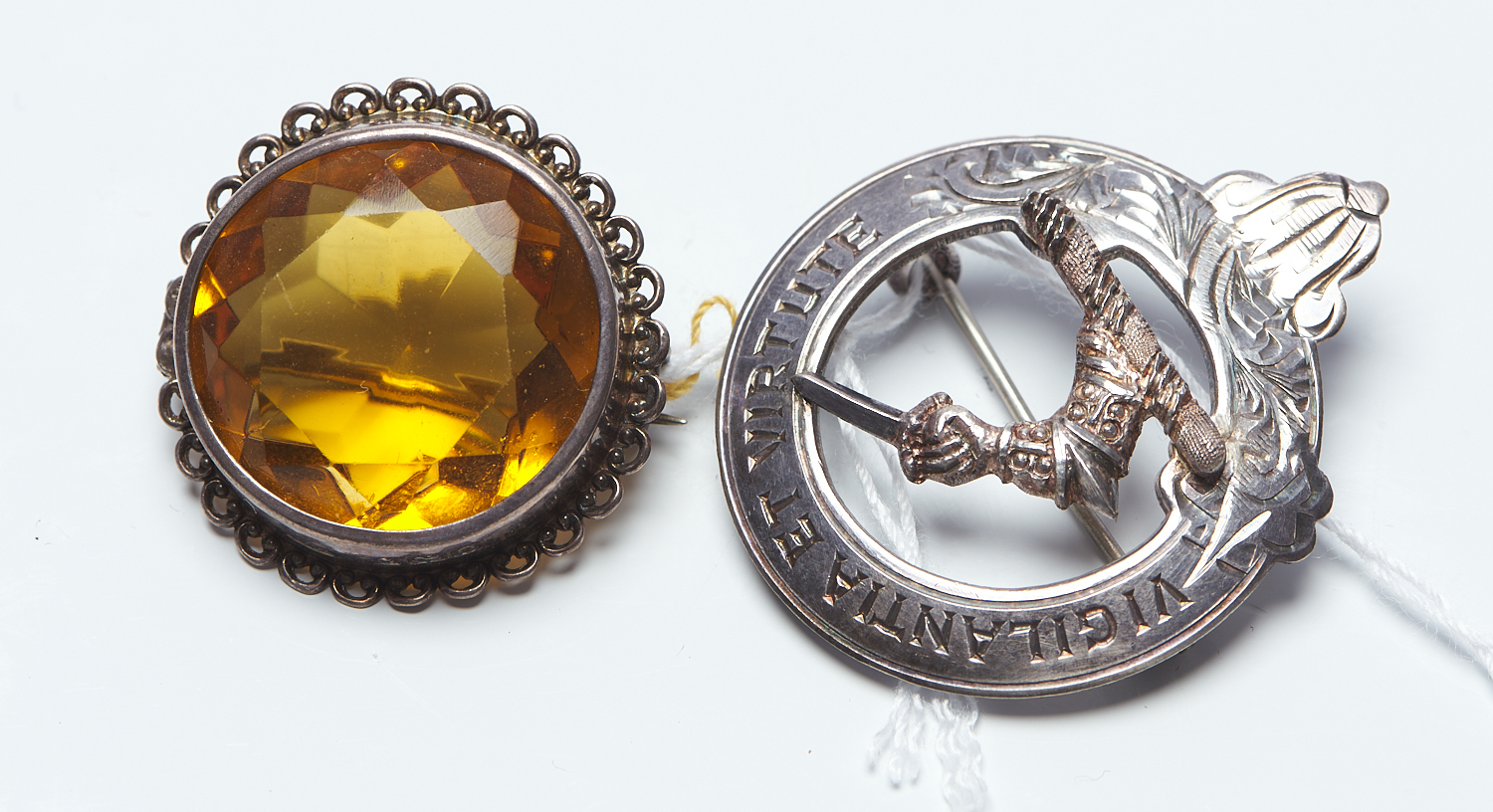 A SCOTTISH PORTER CLAN BROOCH HALLMARKED EDINBURGH 1952-53, TOGETHER WITH A PASTE SET BROOCH IN SILVER HALLMARKED BIRMINGHAM 1913-14