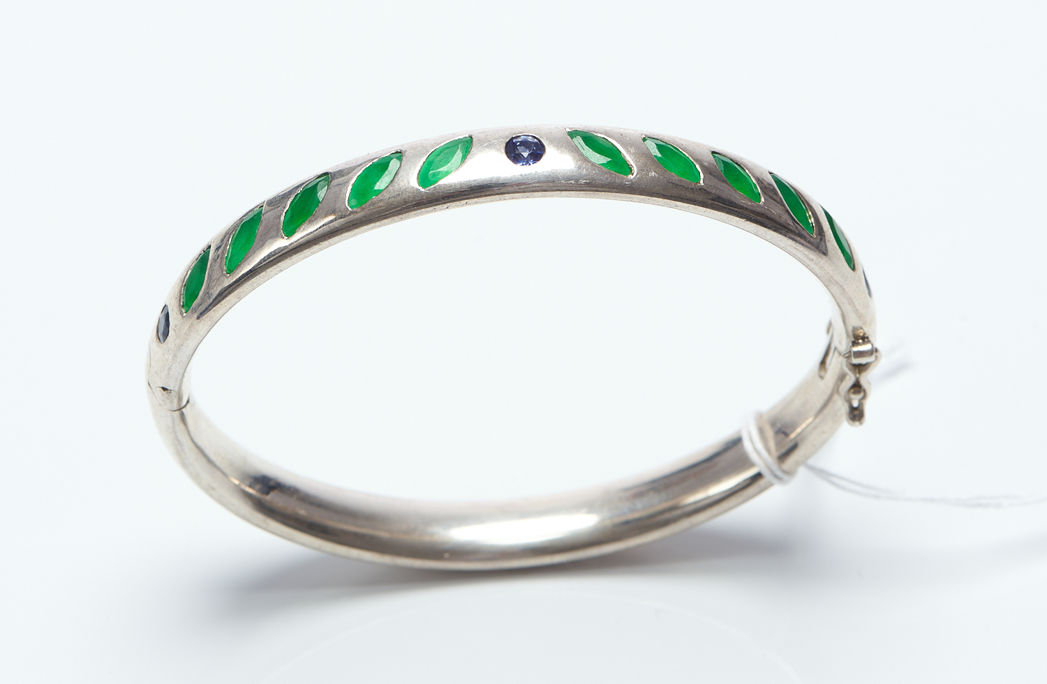 A SAPPHIRE AND EMERALD SOLID SILVER BANGLE, INTERNAL DIAMETER 6.3CMS, 49.1GMS