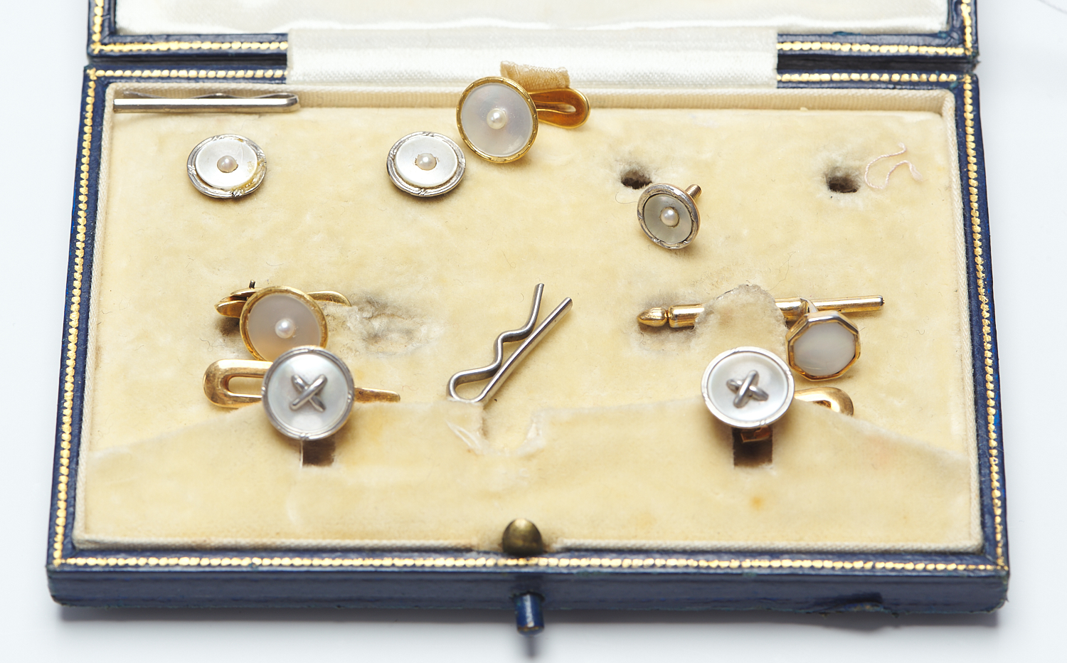 A COLLECTION OF ANTIQUE SHIRT STUDS IN 9CT AND 15CT GOLD, BOXED (A/F)