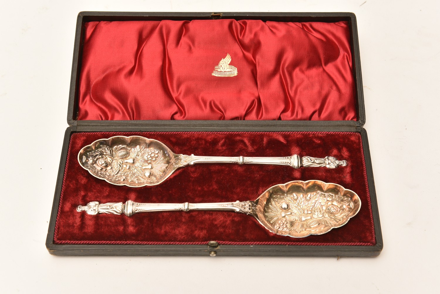 A CASED PAIR OF EPNS BERRY SPOONS, LEONARD JOEL LOCAL DELIVERY SIZE: SMALL