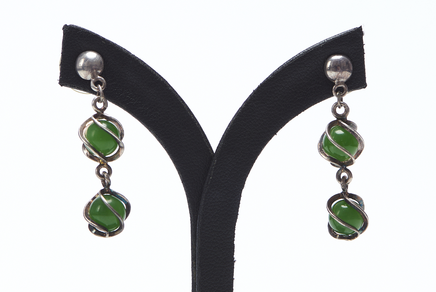 A PAIR OF NEPHRITE EARRINGS IN SILVER, TO POST FITTINGS, LENGTH 3.5CMS