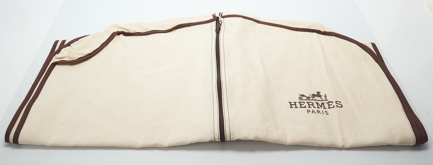 A GARMENT CARRIER BY HERMÈS - Styled in white canvas with brown cotton trim, 115 x 58cm.