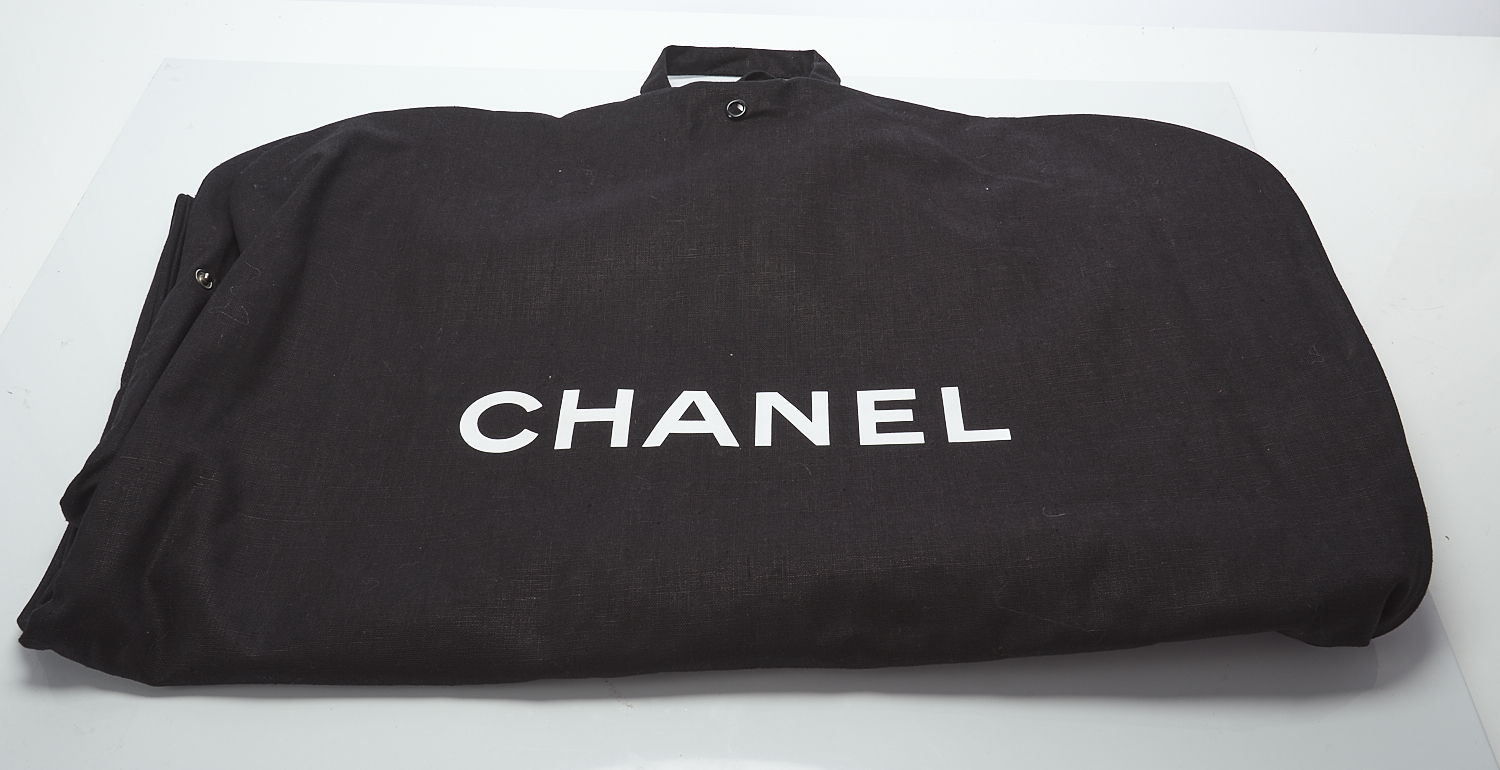 A GARMENT CARRIER BY CHANEL - Styled in black canvas with 'Chanel' printed in white, 120 x 58cm.