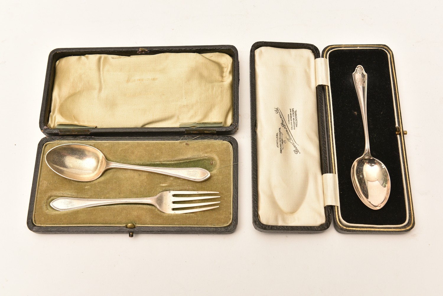 A CASED STERLING SILVER SPOON AND A CASED STERLING SILVER SPOON AND FORK (CASE A/F), LEONARD JOEL LOCAL DELIVERY SIZE: SMALL