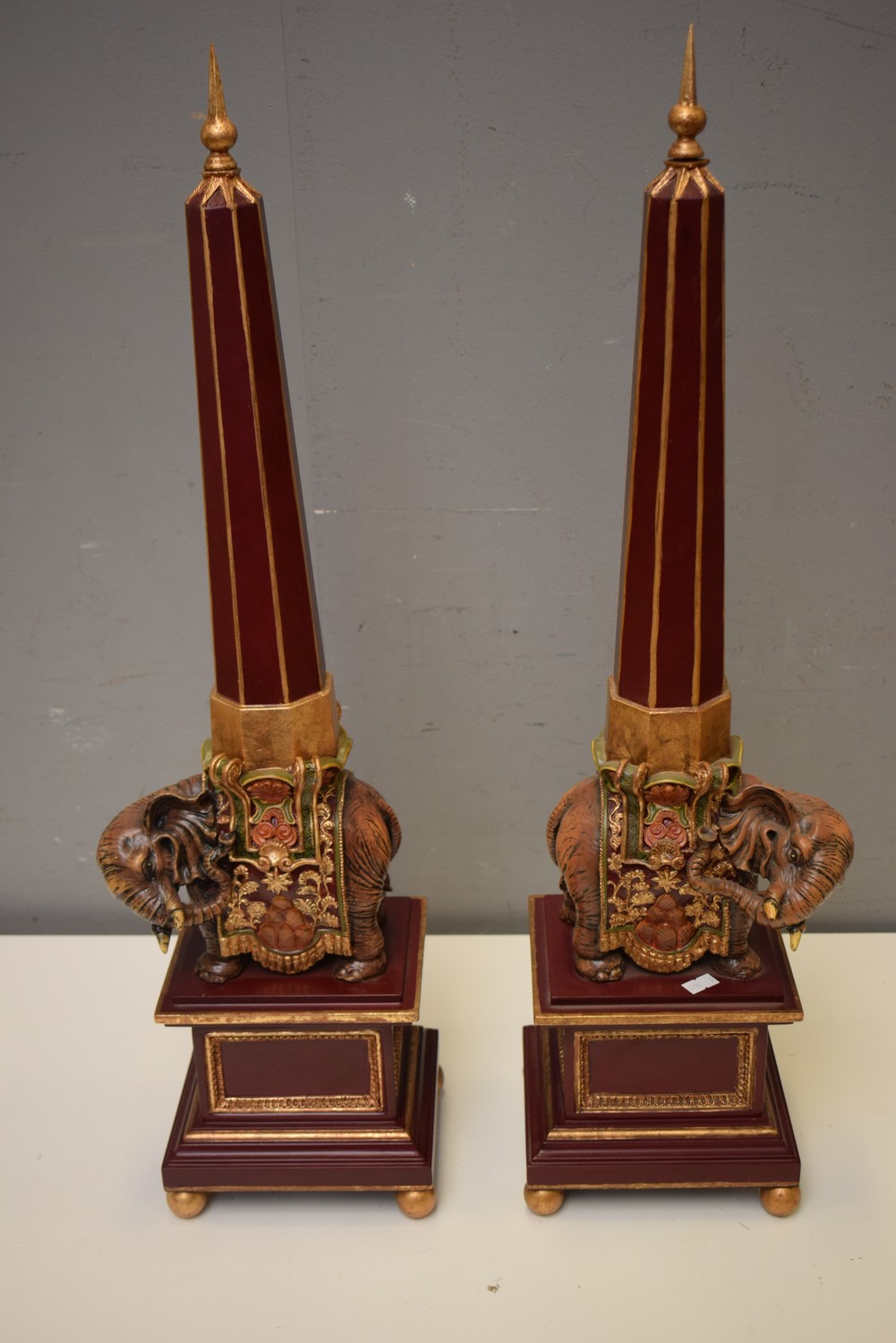 A PAIR OF ORNATELY CARVED OBELISKS WITH ELEPHANT DETAILING (H74 CM) (LEONARD JOEL DELIVERY SIZE: SMALL)