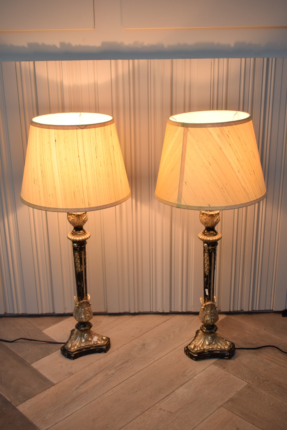 A PAIR OF HAND PAINTED GILT EFFECT TABLE LAMPS (85H x 36D CM)