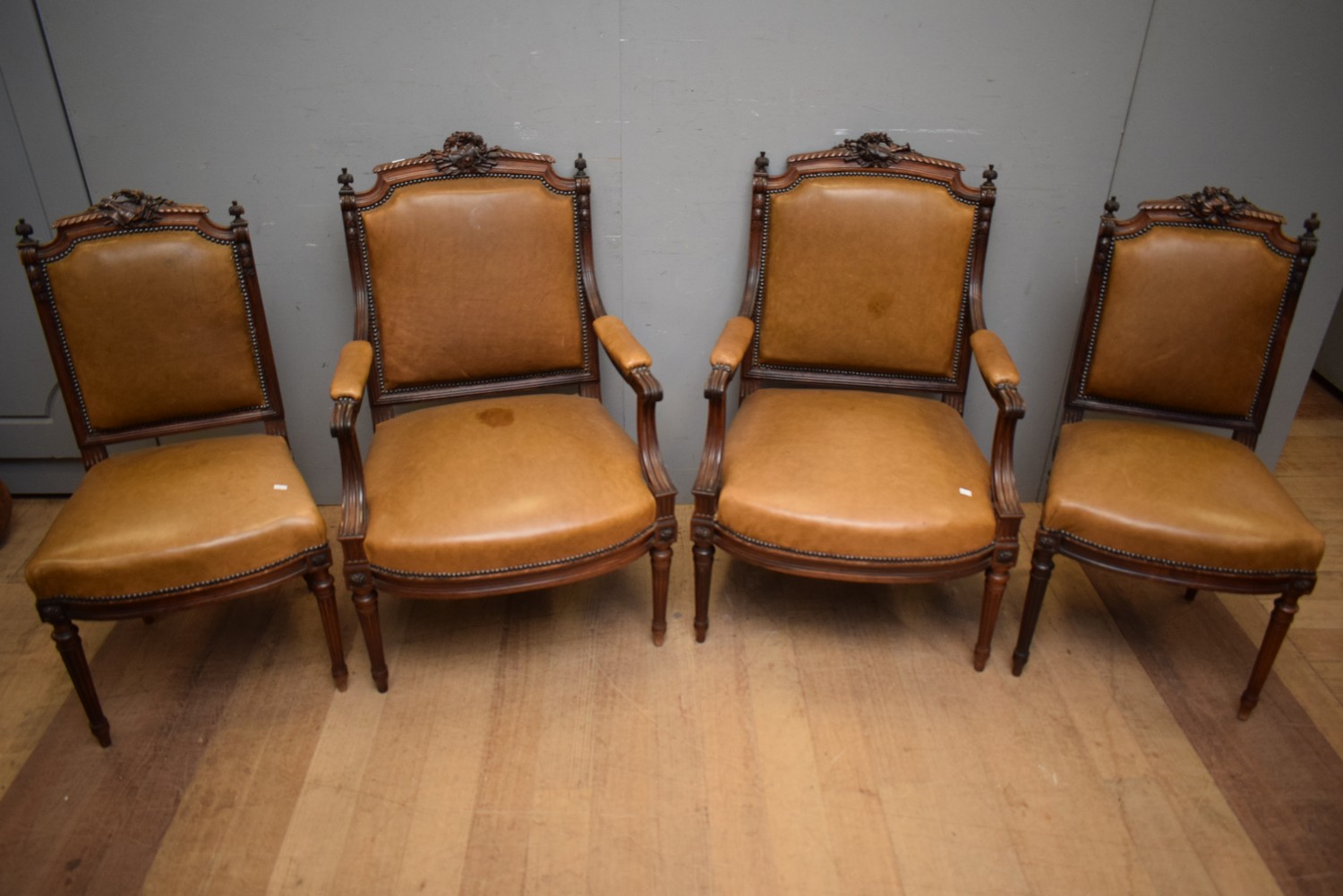 A SET OF FOUR LOUIS XVI STYLE LEATHER CHAIRS (A/F) (99H x 65W x 72D CM) (LEONARD JOEL DELIVERY SIZE: LARGE)