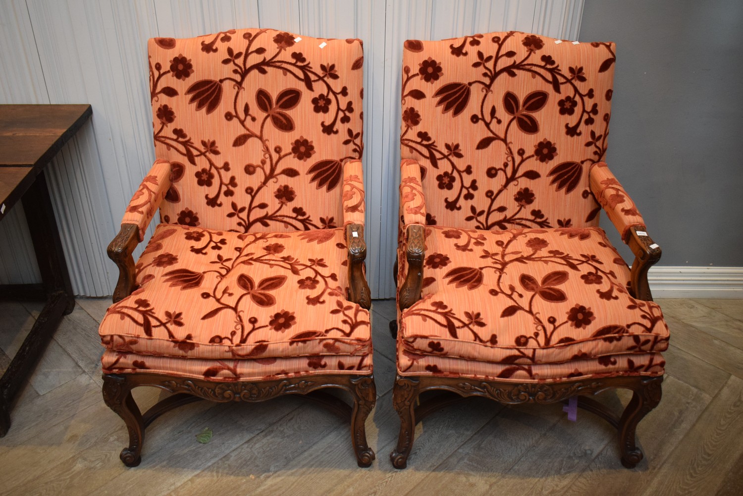 A PAIR OF FLORAL UPHOLSTERED CARVED TIMBER ARMCHAIRS (99H x 67W x 82D CM) (LEONARD JOEL DELIVERY SIZE: LARGE)