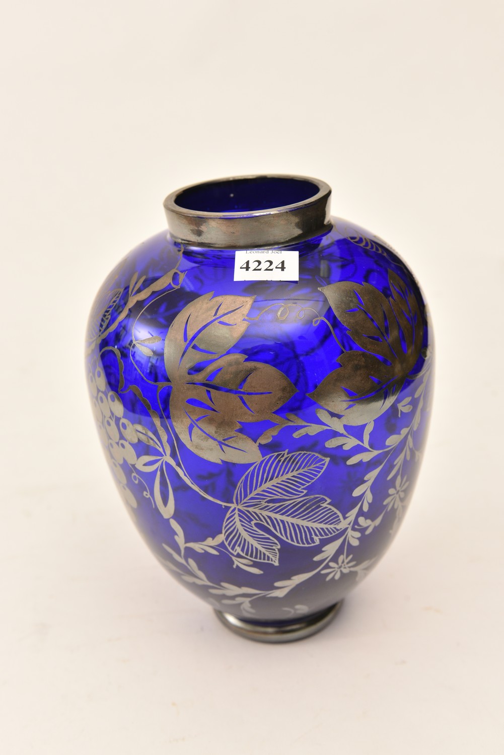 A COBALT SUNG GLASS VASE WITH SILVERED BOTANICAL PATTERNS (25 CM H), LEONARD JOEL LOCAL DELIVERY SIZE: SMALL