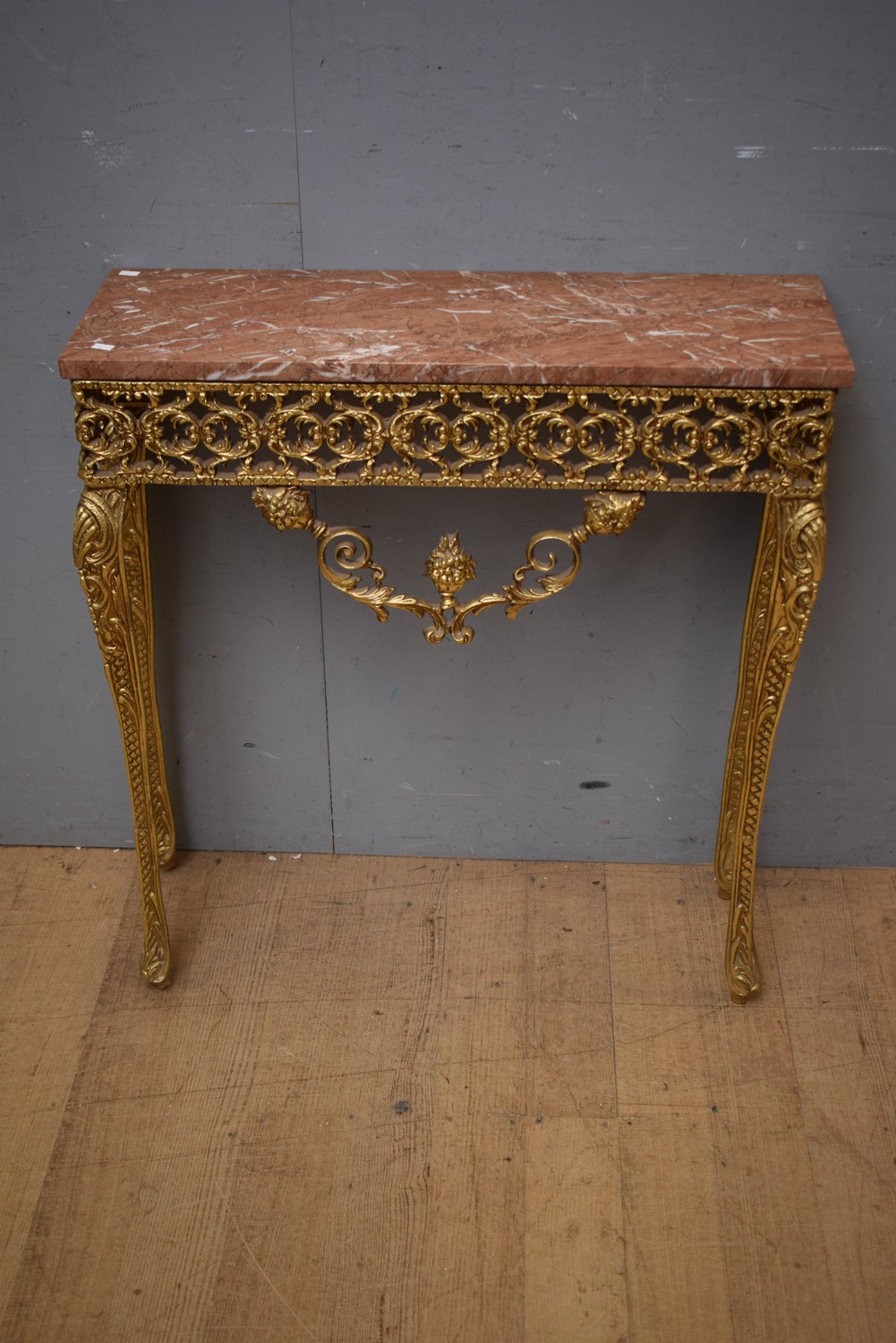A DECORATIVE GILT EFFECT HALL CONSOLE WITH MARBLE TOP (85H x 78W x 26D CM) (LEONARD JOEL DELIVERY SIZE: MEDIUM)