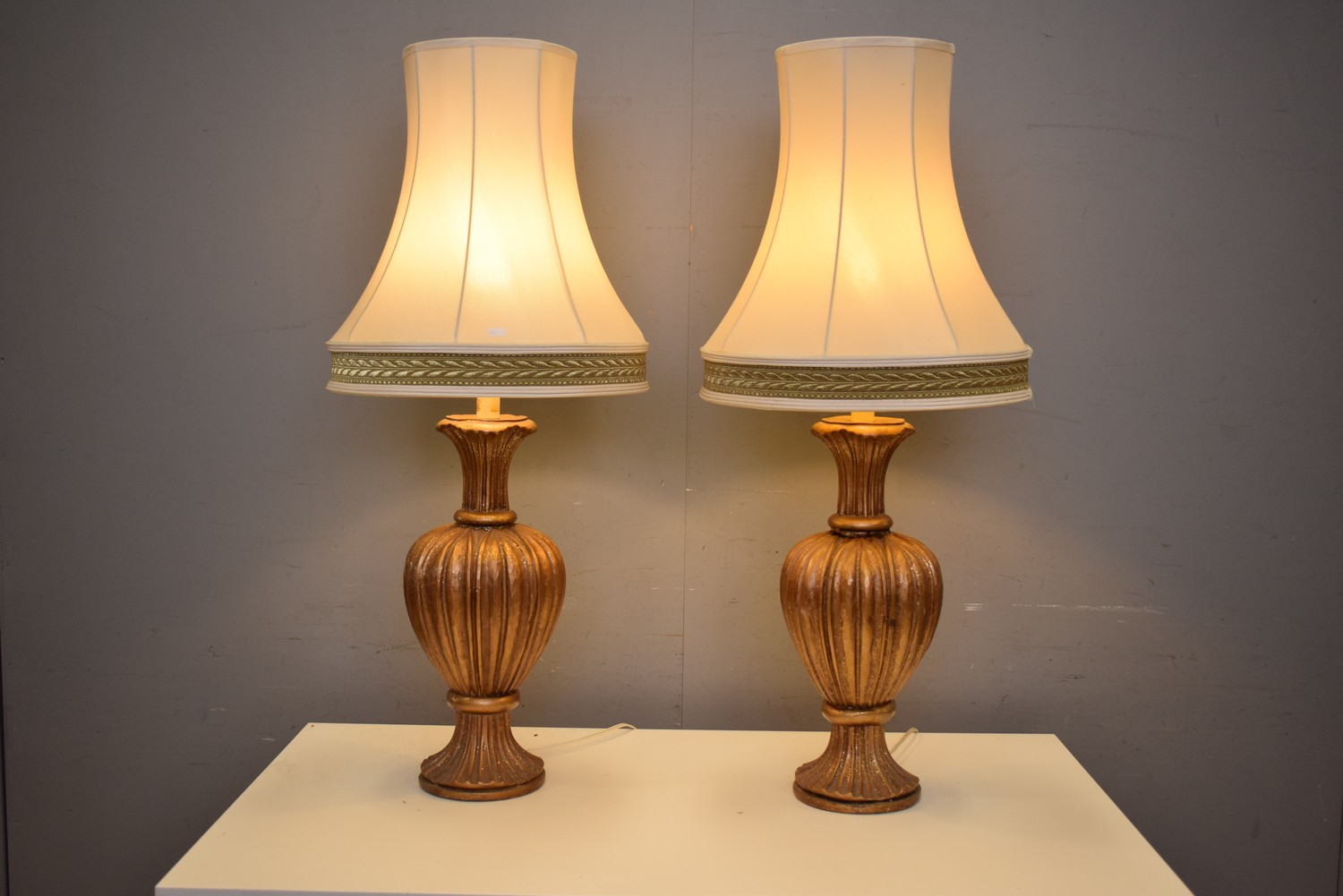 A PAIR OF DECORATIVE GILT EFFECT TABLE LAMPS (A/F) (H101 X D45 CM) (LEONARD JOEL DELIVERY SIZE: MEDIUM)
