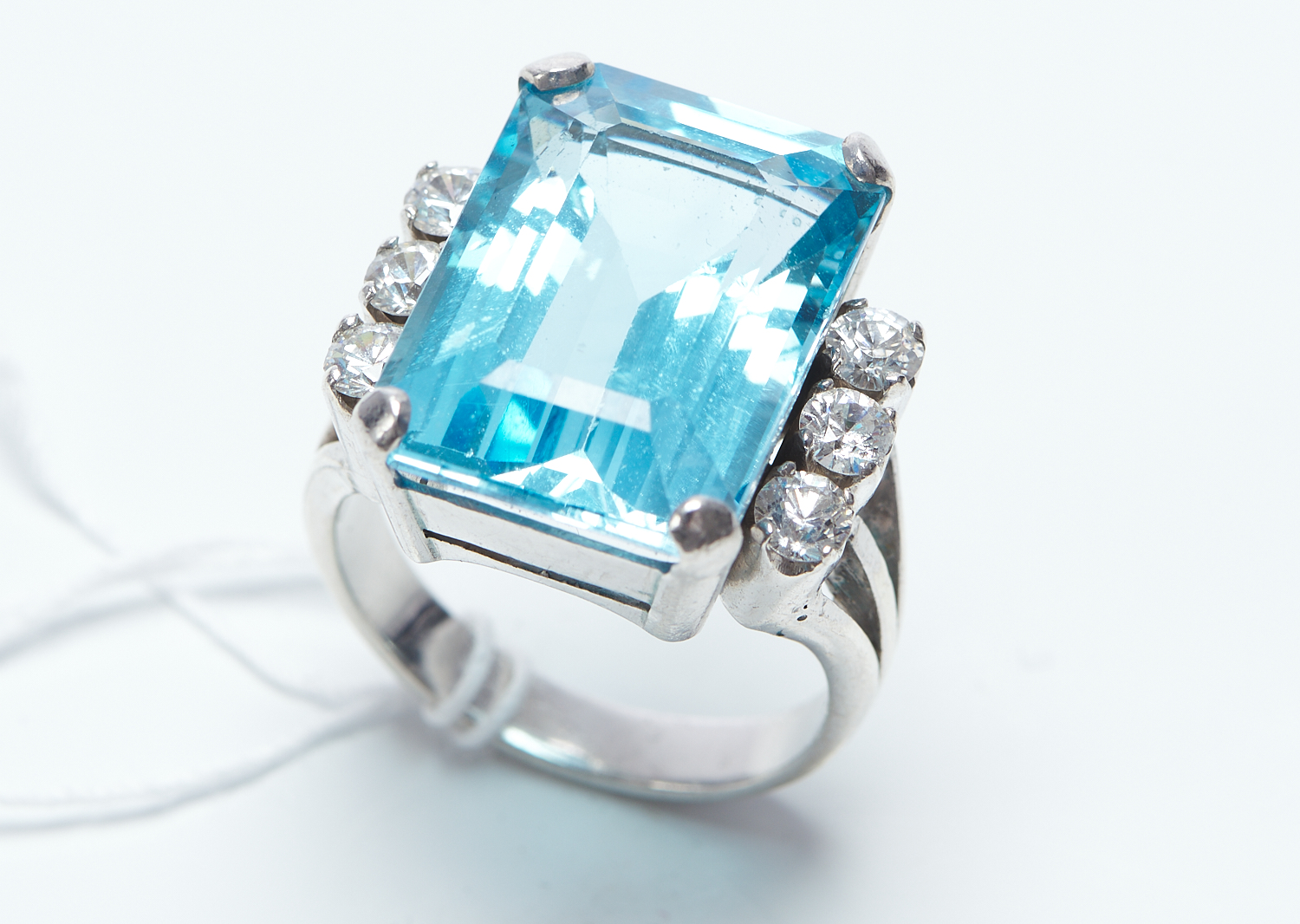 A BLUE TOPAZ AND CUBIC ZIRCONIA COCKTAIL RING IN STERLING SILVER, RING SIZE N-O