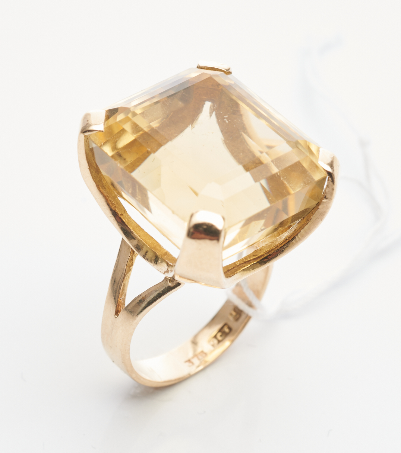 A CITRINE COCKTAIL RING IN 9CT GOLD, FEATURING A RECTANGULAR STEP CUT CITRINE OF 36.30CTS, SIZE N, 12.5GMS