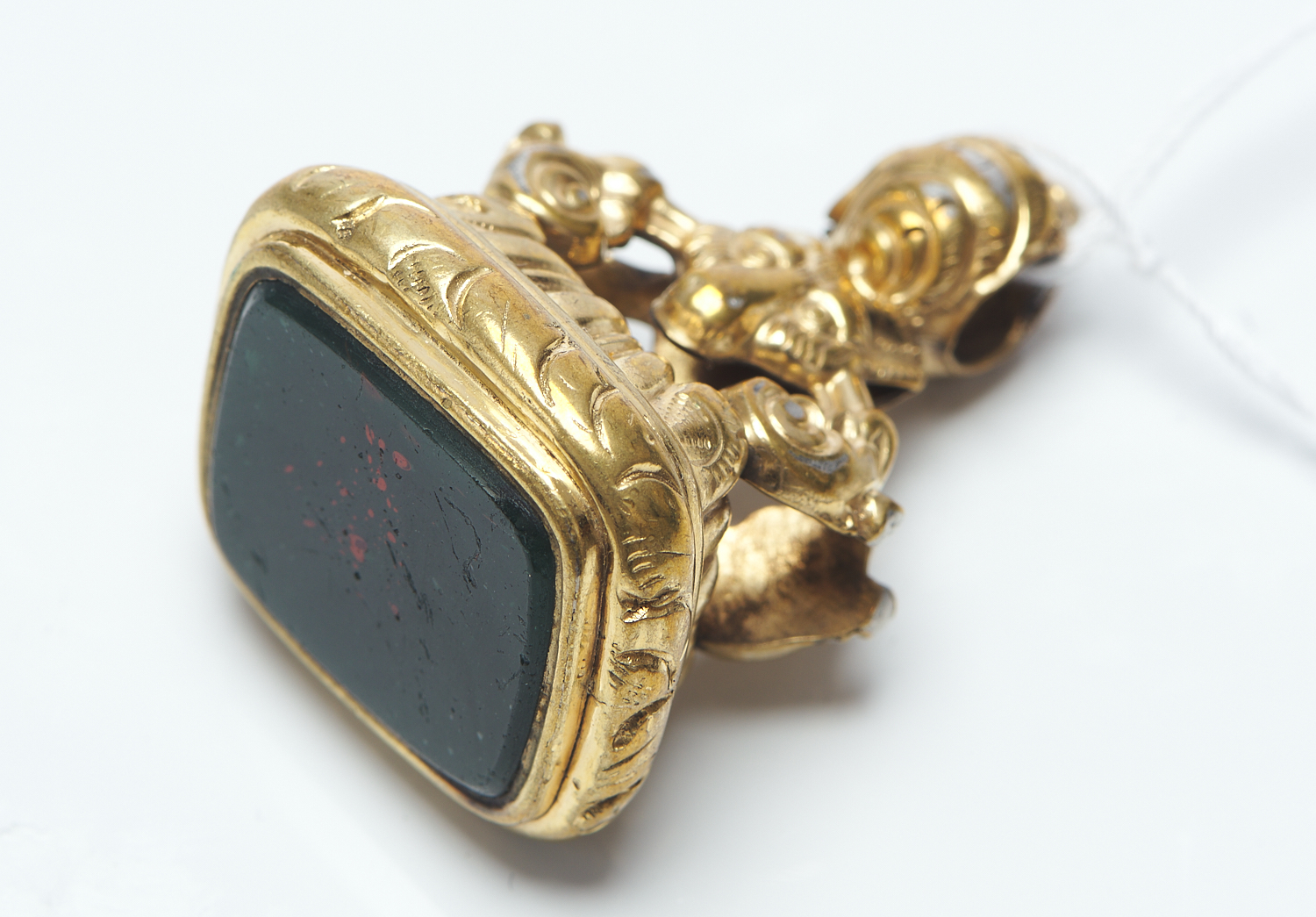 AN ANTIQUE BLOODSTONE SEAL IN GILT, LENGTH 4CMS
